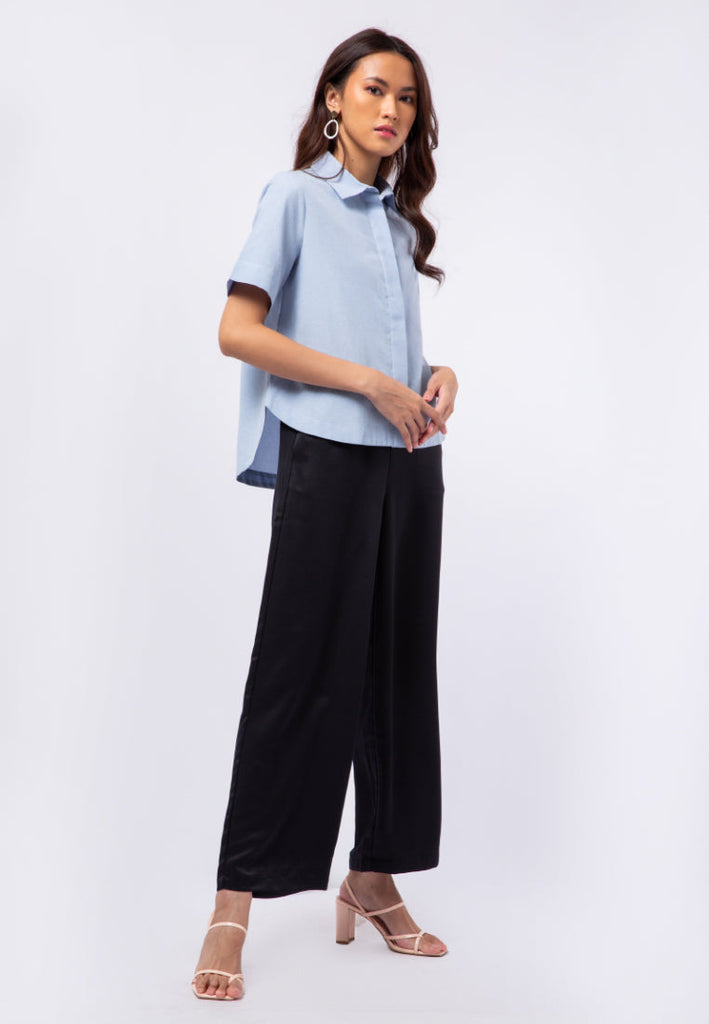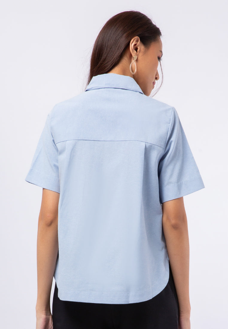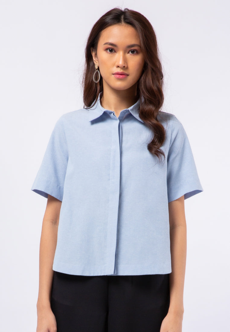 Blouse lengan pendek, Kerah kemeja, Hidden front button opening, Wide sleeves detail, Material: Cotton, Fit: Regular, Color: Light Blue, Model info: Model Wearing Size S For Tops, Model Height 174 cm, Bust: 78 cm, Waist: 70 cm, Hips: 90 cm, Art: 5-BSWKSG122E101