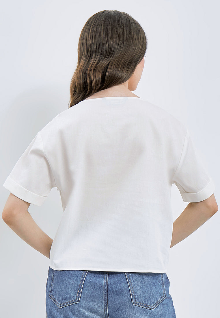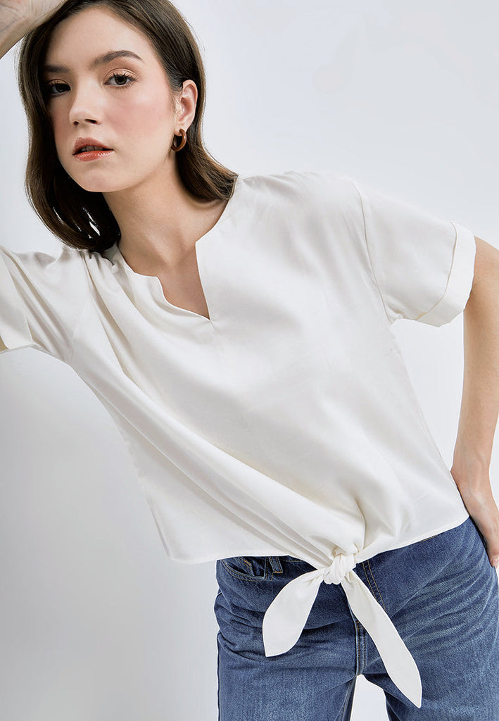 Blouse lengan pendek, V-neckline, Roll up sleeves, Detail knot di bagian depan, Material: Cotton Rayon Twill, Fit: Regular, Color: Off White, Model info: Model Wearing Size S for Top, Model Height 171 cm, Bust: 78 cm, Waist: 59 cm, Hips: 90 cm, Art: 5-BSWKCA122G338