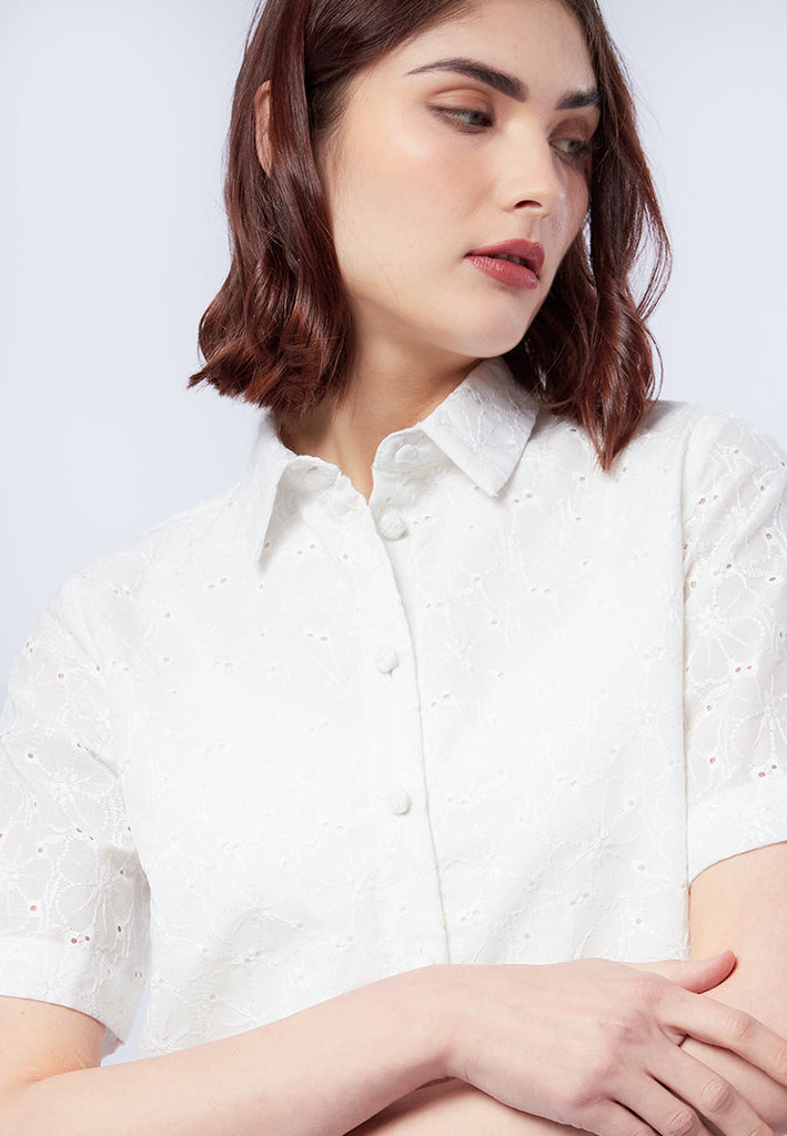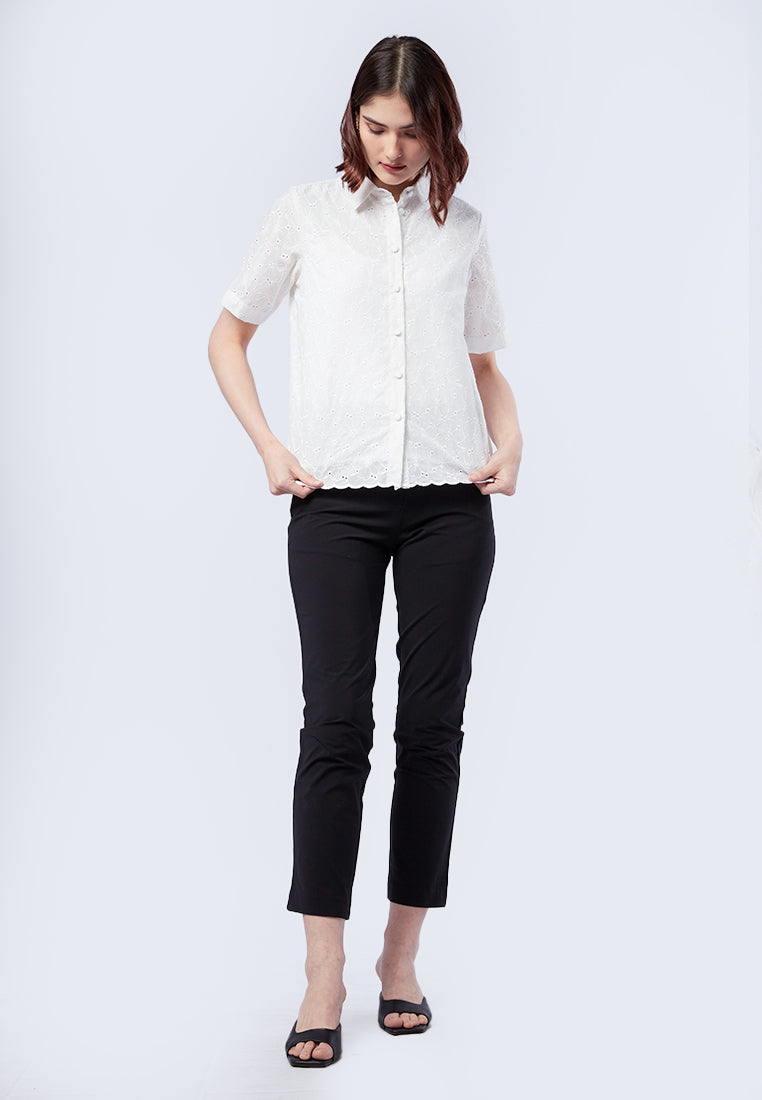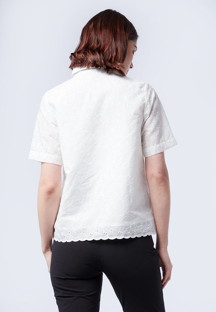 Blouse lengan pendek, Kerah kemeja, Front button opening, Scallop hemline details, Material: Cotton Eyelet, Fit: Regular, Color: Off White, Model info: Model Wearing Size S for Top, Size S for Pants, Model Height 175 cm, Bust: 84 cm, Hips: 90 cm, Art: 5-BSWKSG223L060