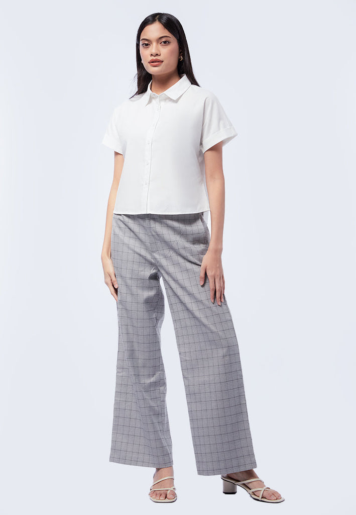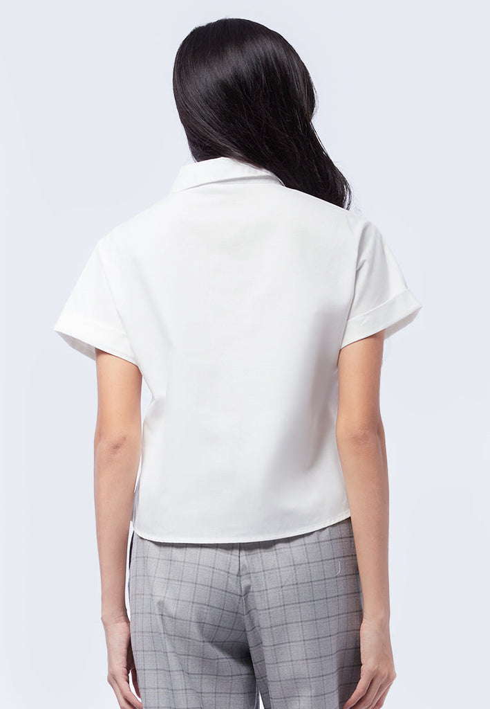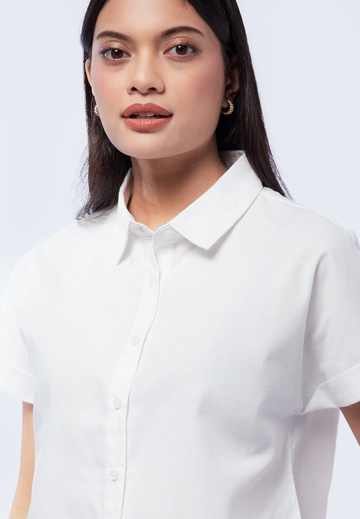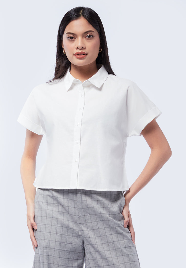 Blouse lengan pendek, Kerah kemeja, Roll up sleeve details, Front button opening, Material: Oxford, Fit: Regular, Color: Off White, Model info: Model Wearing Size S for Top, Size S for Pants, Model Height 175 cm, Bust: 77 cm, Hips: 88 cm, Art: 5-BSWKSG224A022