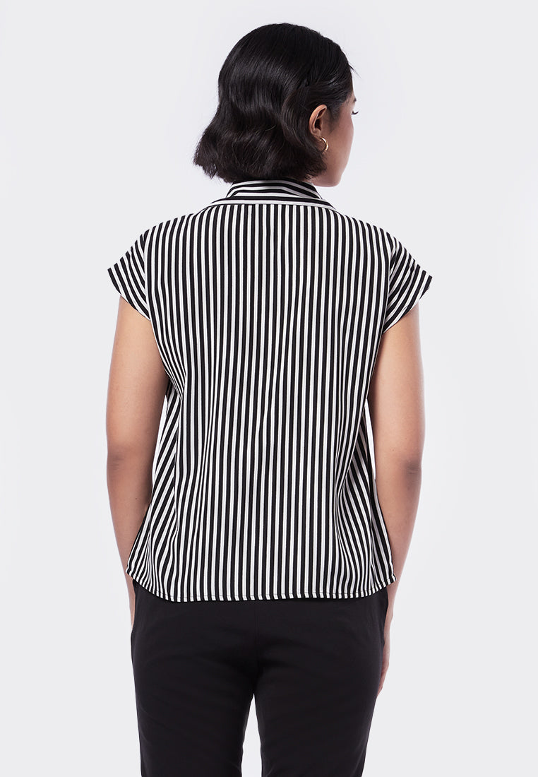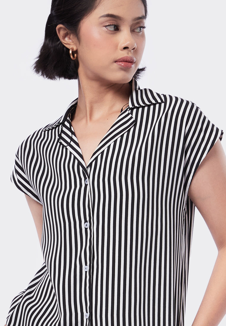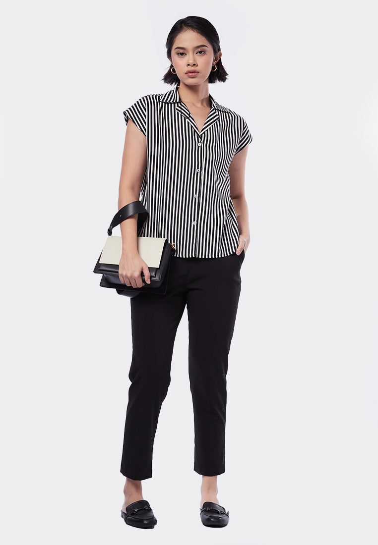 Blouse lengan pendek, Notch collar, Front button opening, Stripe printed fabric, Material: Polyester, Fit: Regular, Color: Black, Model info: Model Wearing Size S for Top, Size 26 for Pants, Model Height 173 cm, Bust: 78 cm, Waist: 62, Hips: 82 cm, Art: 5-BSWKSG123G015