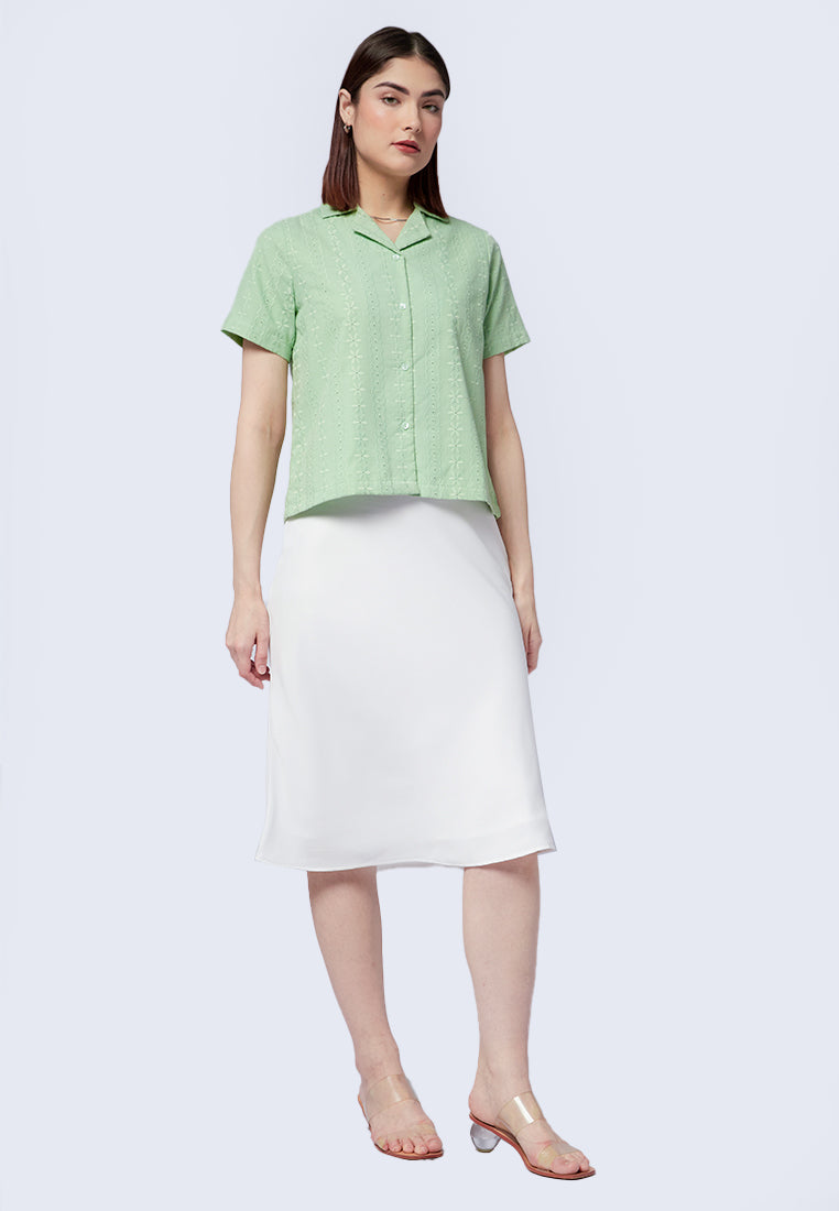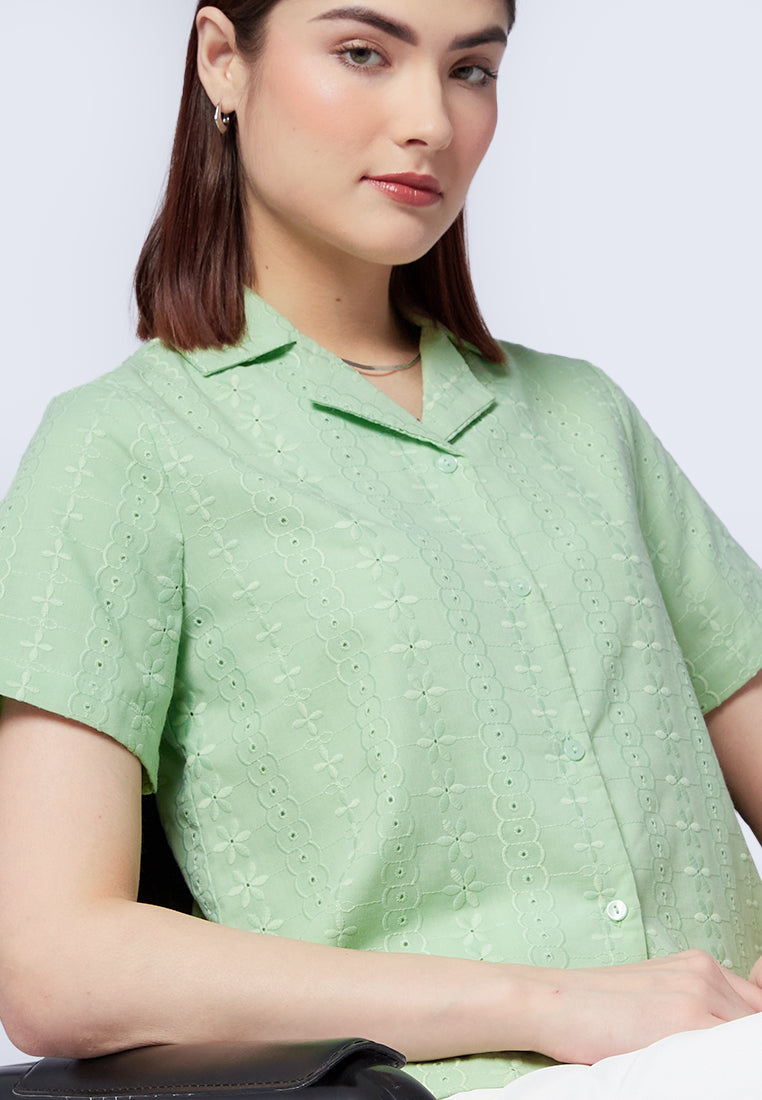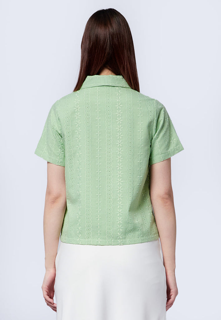 Blouse lengan pendek, Notch collar, Textured fabric, Front button opening, Material: Cotton Eyelet, Fit: Regular, Color: Mint, Model info: Model Wearing Size S for Top, Size 25 for Pants, Model Height 175 cm, Bust: 84 cm, Hips: 90 cm, Art: 5-BSWKSG124B160