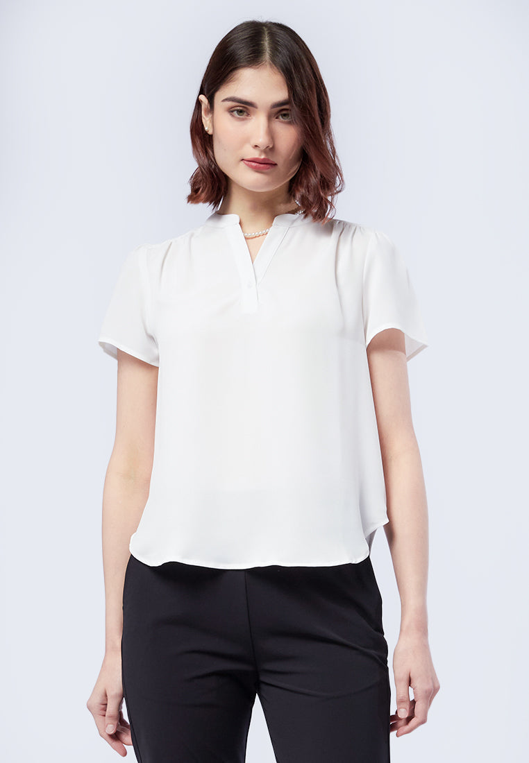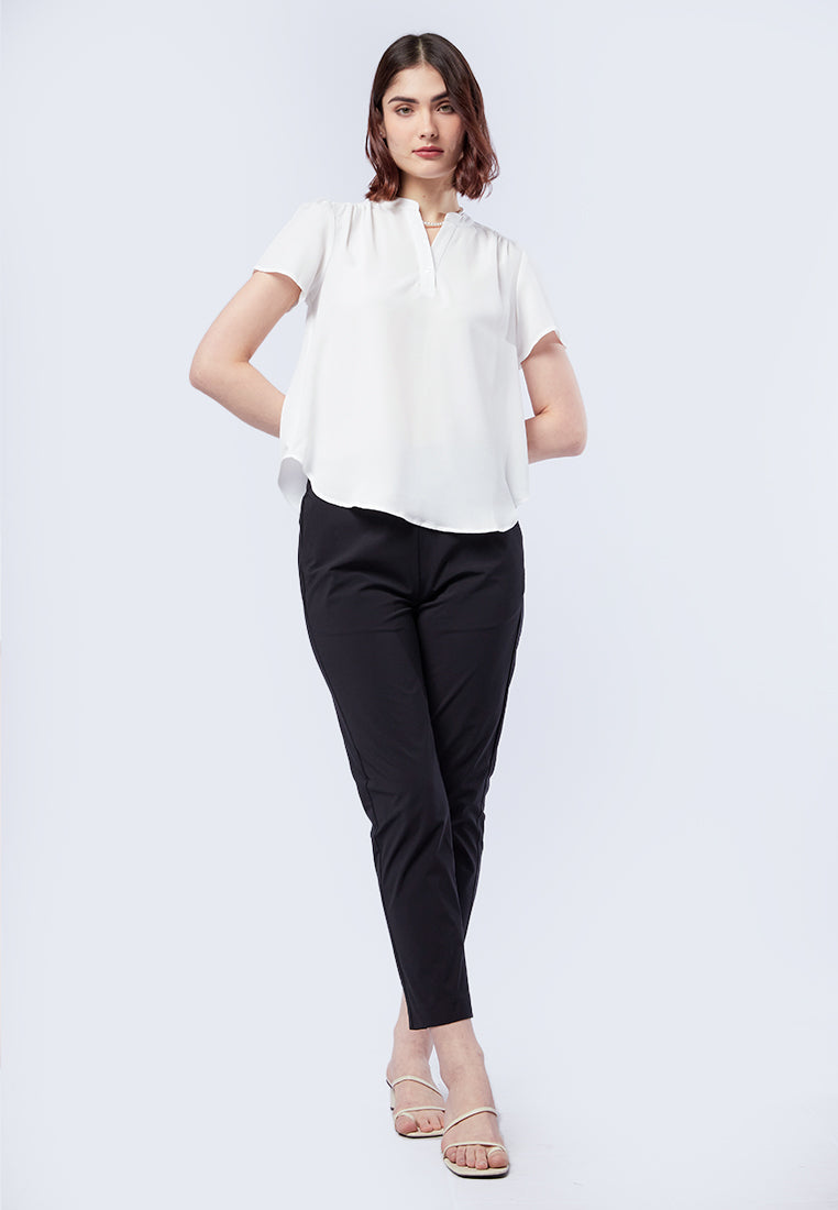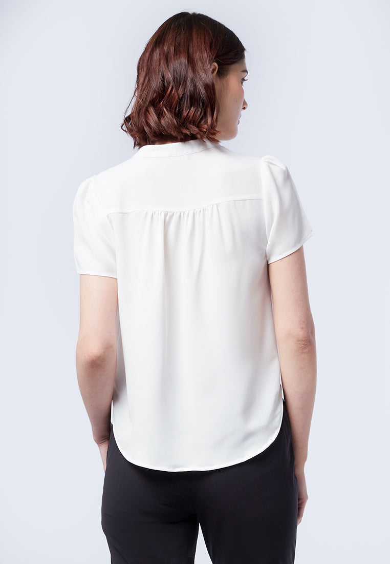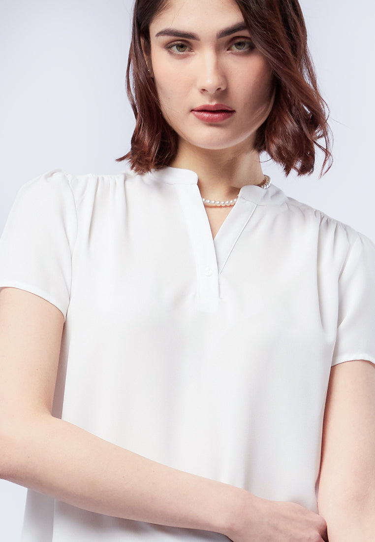 Blouse lengan pendek, V-neck, Gathered shoulder details, Puffy sleeves, Material: Poly Cotton, Fit: Regular, Color: Off White, Model info: Model Wearing Size S for Top, Size S for Pants, Model Height 175 cm, Bust: 84 cm, Hips: 90 cm, Art: 5-BSWKSG224A045