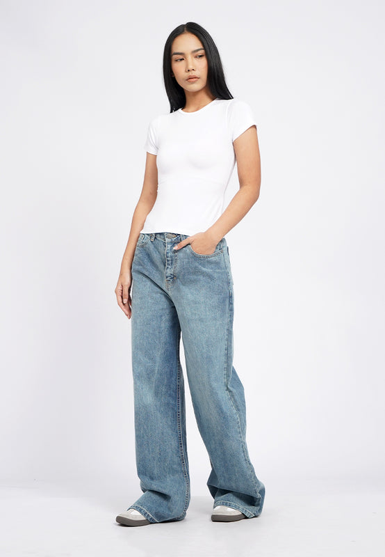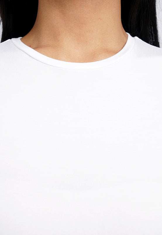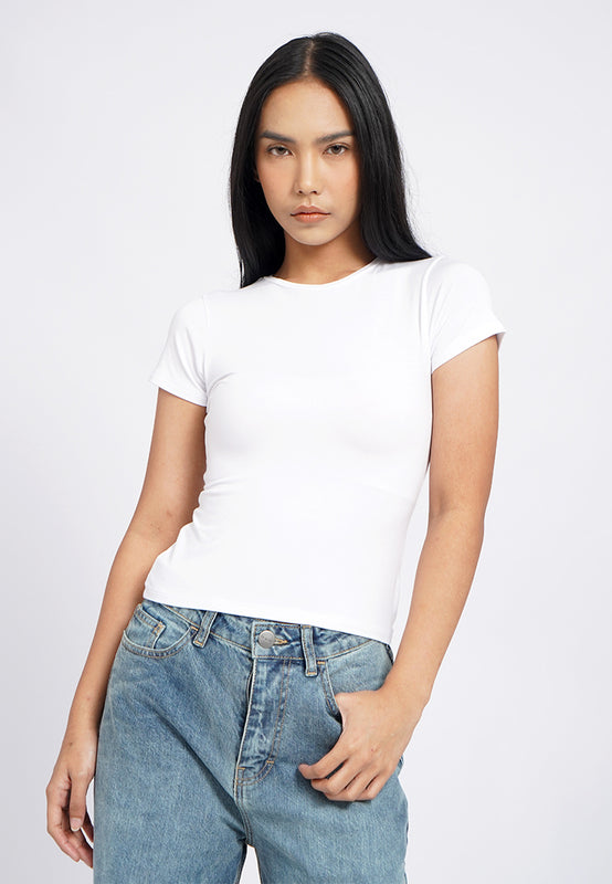 T-shirt lengan pendek, Round neck, Fitted stretch fabric, Material: Modal Spandex, Fit: Fitted, Color: Off White, Model info: Model Wearing Size S for Top, Size S for Pants, Model Height 165 cm, Bust: 86 cm, Waist: 63 cm, Hips: 78 cm