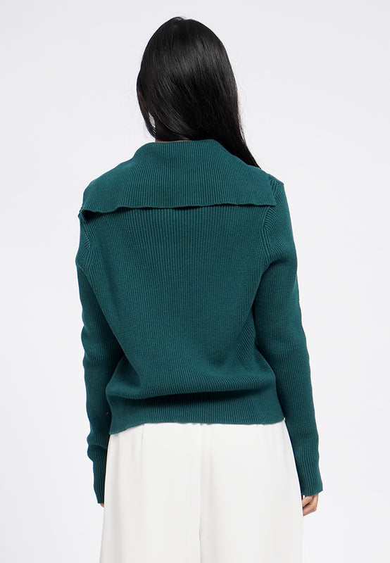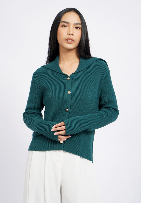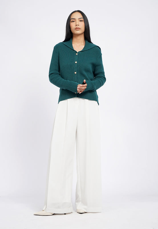 Atasan knit lengan panjang, V-neck with ribbed collar, Contrast front button opening, Material: Flat Knit, Fit: Regular, Color: Teal, Model info: Model Wearing Size S for Top, Size S for Pants, Model Height 165 cm, Bust: 86 cm, Waist: 63 cm, Hips: 78 cm