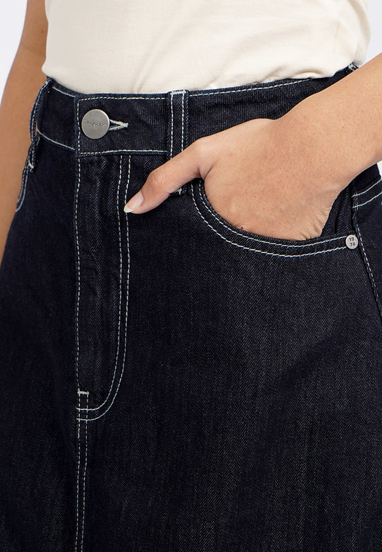 Rok maxi dengan fitting balon yang modern dengan washing modern dark blue. Memberikan siluet seperti balon pada rok. Dengan bukaan resleting dan kancing metal pada bagian depan. Terdapat lima pocket pada bagian depan dan belakang. Menggunakan bahan denim 100% cotton yang rigid dan nyaman digunakan. Dengan pelapis lining pada bagian dalam., Material: 100% Cotton, Fit: Balloon, Color: Dark Blue, Model info: Model Wearing Size S, Model Height 165 cm, Bust: 86 cm, Waist: 63 cm, Hips: 78 cm