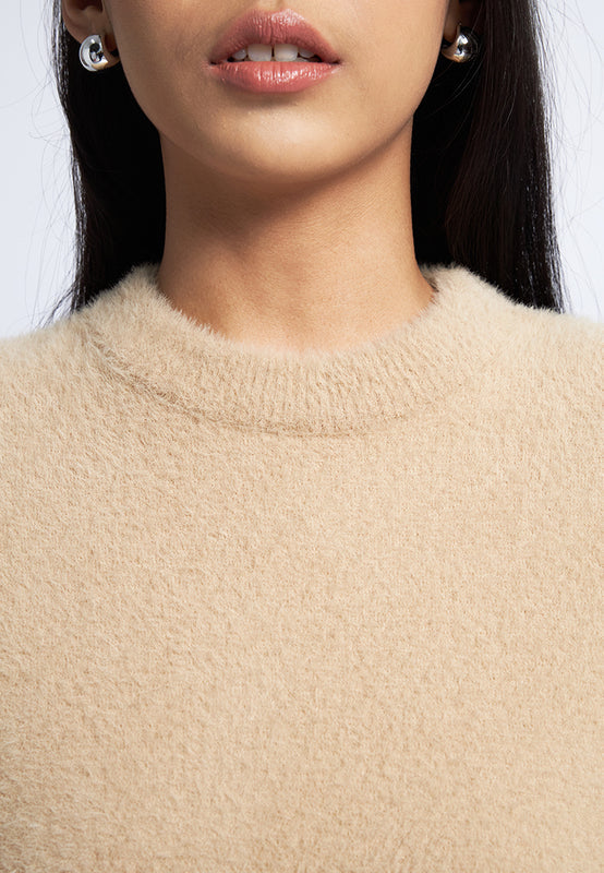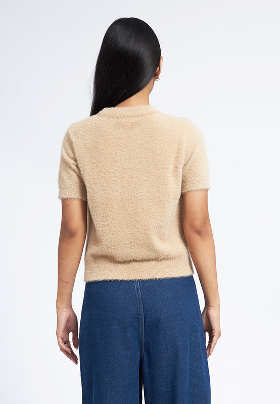 Atasan lengan pendek, Round neck, Hairy textured knit fabric, Ribbed hemline, Material: Hairy Yarn, Fit: Regular, Color: Khaki, Model info: Model Wearing Size S for Top, Size S for Pants, Model Height 165 cm, Bust: 86 cm, Waist: 63 cm, Hips: 78 cm