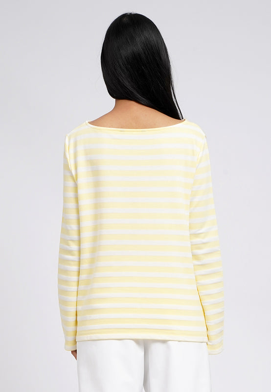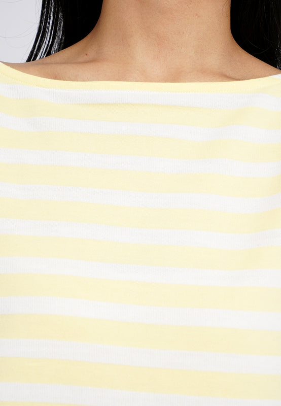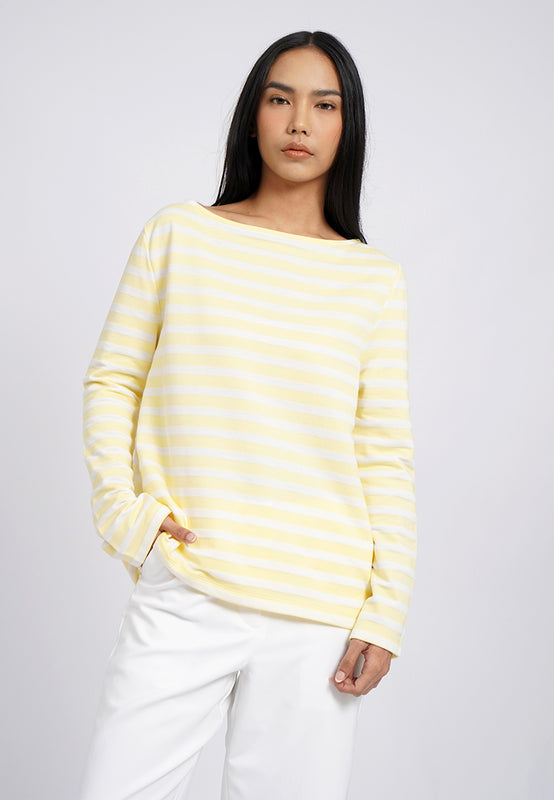 Atasan lengan panjang, Boat neck, Stripes printed fabric, Material: Baby Terry, Fit: Regular, Color: Lt. Yellow, Model info: Model Wearing Size S for Top, Size S for Pants, Model Height 165 cm, Bust: 86 cm, Waist: 63 cm, Hips: 78 cm