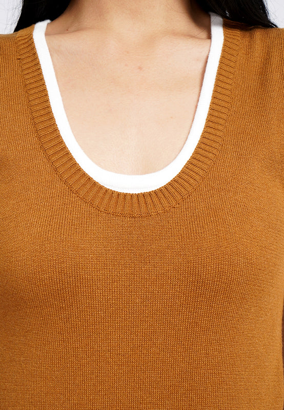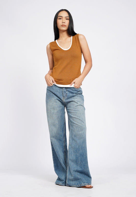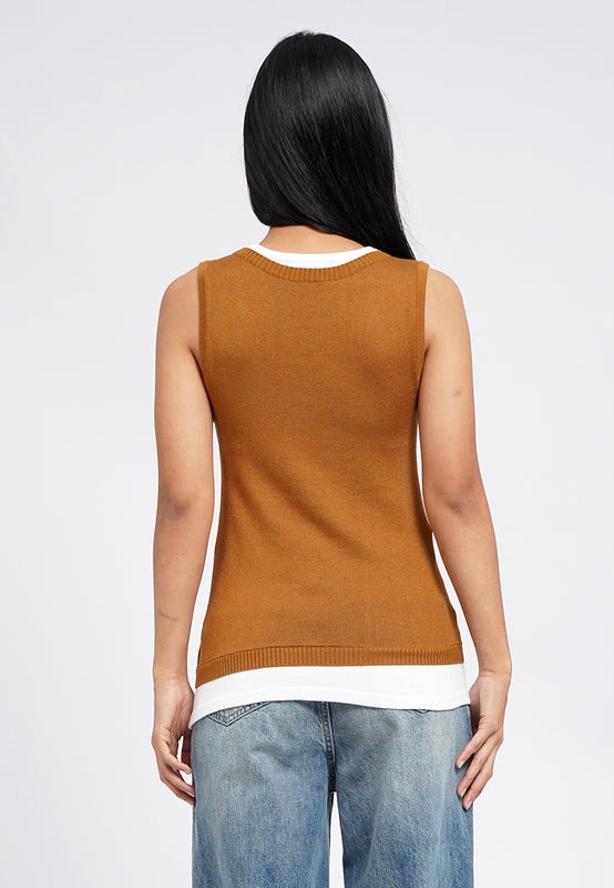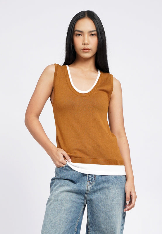 Atasan tanpa lengan, Scoop neck, Contrast layered details, Material: Flat Knit, Fit: Fitted, Color: Tobacco, Model info: Model Wearing Size S for Top, Size S for Pants, Model Height 165 cm, Bust: 86 cm, Waist: 63 cm, Hips: 78 cm