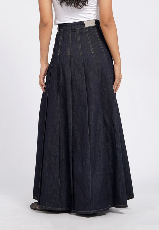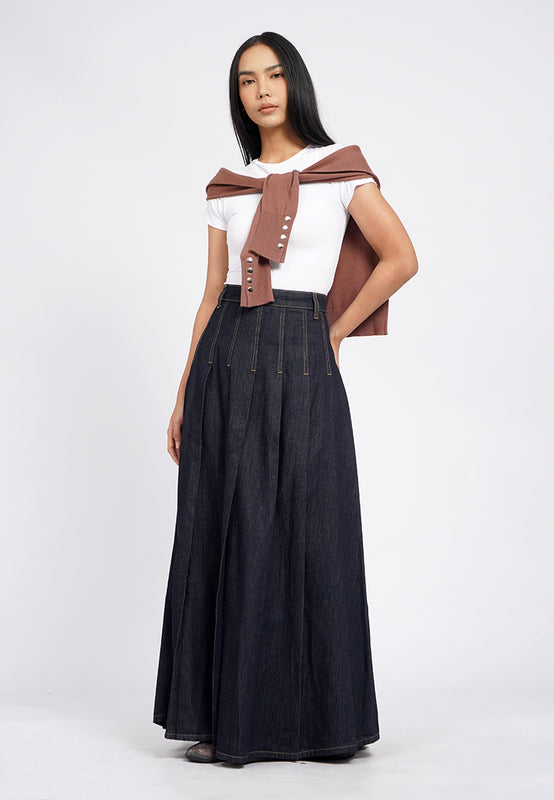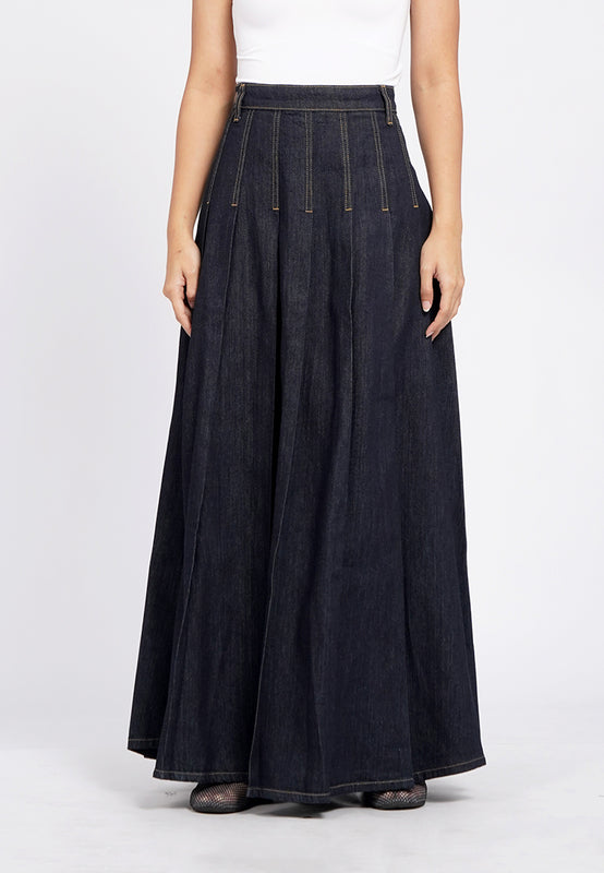 Pleated Maxi Denim Skirt