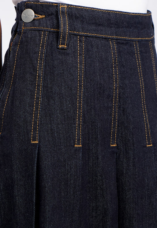 Rok maxi dengan aksen pleats di keseluruhan body rok dengan washing dark blue. Dengan bukaan resleting dan kancing metal pada bagian sisi kanan pakai. Menggunakan bahan denim 100% cotton yang rigid dan nyaman digunakan., Material: 100% Cotton, Fit: Maxi, Color: Dark Blue, Model info: Model Wearing Size S, Model Height 165 cm, Bust: 86 cm, Waist: 63 cm, Hips: 78 cm