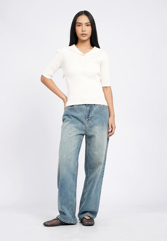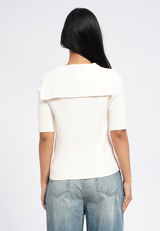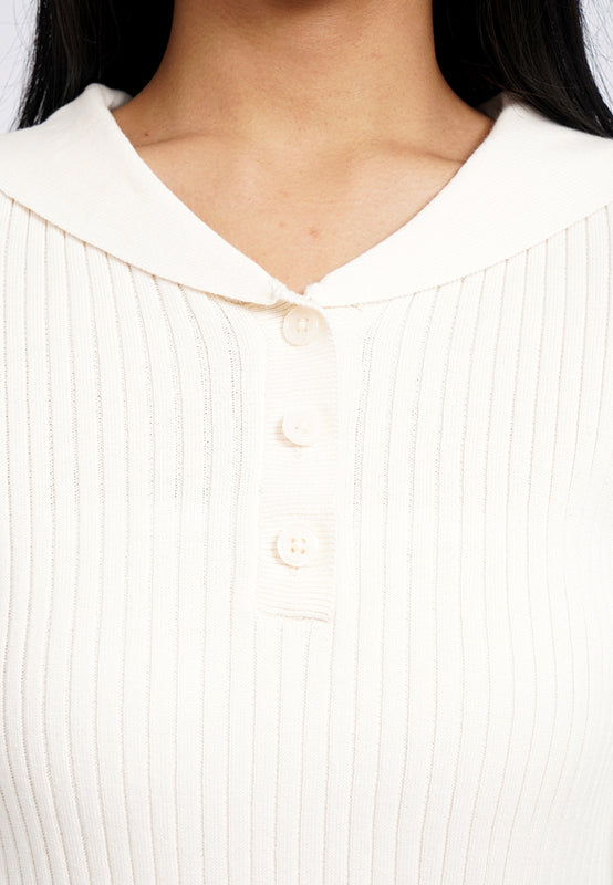 Atasan knit lengan pendek, V-neck with collar, Textured fabric, Front button opening, Material: Flat Knit, Fit: Regular, Color: Ecru, Model info: Model Wearing Size S for Top, Size S for Pants, Model Height 165 cm, Bust: 86 cm, Waist: 63 cm, Hips: 78 cm