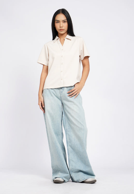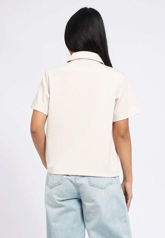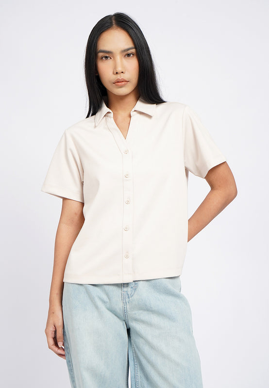 Atasan lengan pendek, V-neck with collar, Front button opening, Material: Double Knit, Fit: Regular, Color: Ecru, Model info: Model Wearing Size S for Top, Size S for Pants, Model Height 165 cm, Bust: 86 cm, Waist: 63 cm, Hips: 78 cm