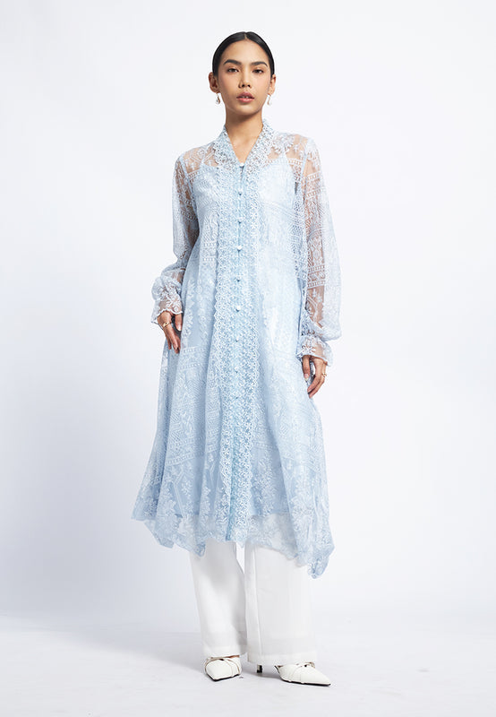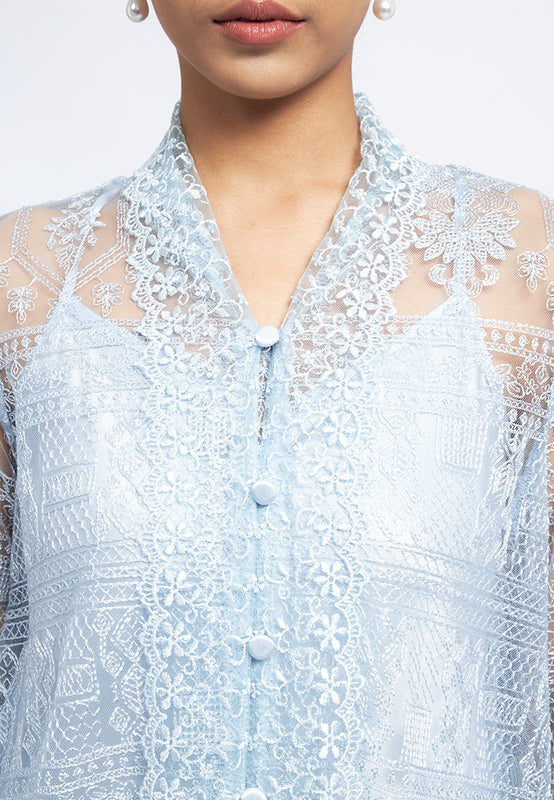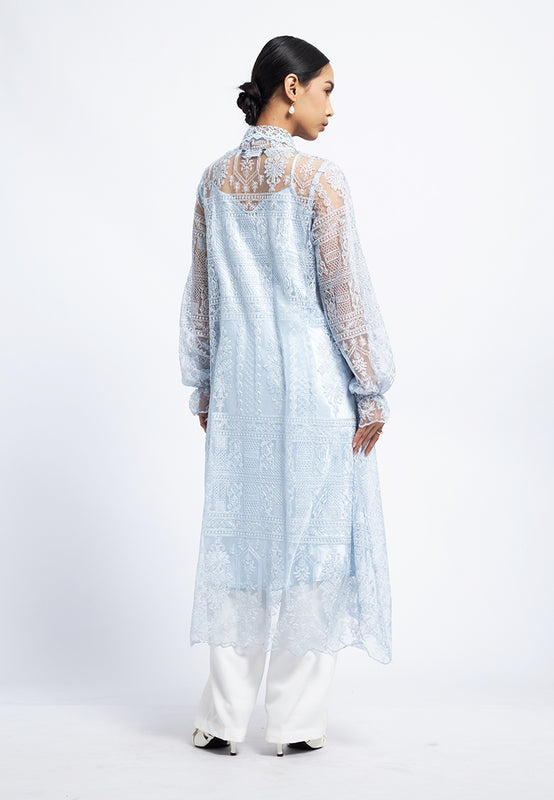 Tunik lengan panjang, V-neck, See through lace fabric, Front button opening, Include Inner, Material: Polyester, Fit: Loose, Color: Dusty Blue, Model info: Model Wearing Size S for Top, Size S for Pants, Model Height 165 cm, Bust: 86 cm, Waist: 63 cm, Hips: 78 cm