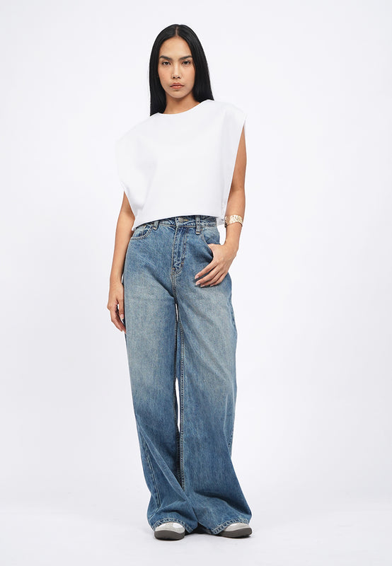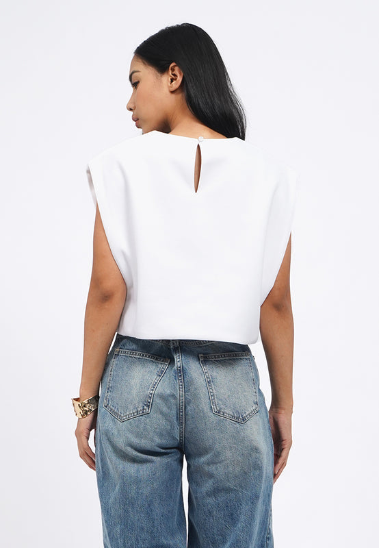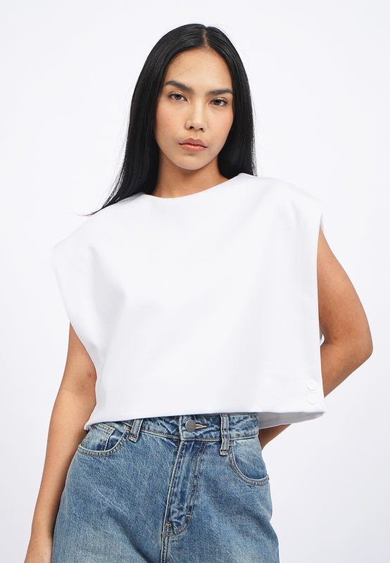 Atasan tanpa lengan, Crop length, Open side with button closure, Back button opening, Material: Double Knit, Fit: Boxy, Color: Off White, Model info: Model Wearing Size S for Top, Size S for Pants, Model Height 165 cm, Bust: 86 cm, Waist: 63 cm, Hips: 78 cm