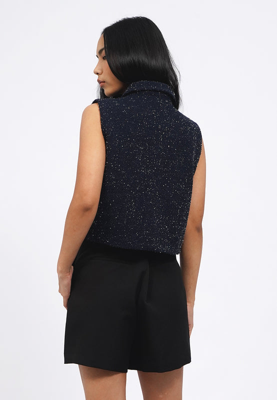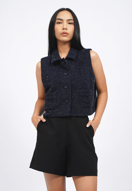 Atasan tanpa lengan, Shirt collar, Crop length, Double front pocket, Material: Tweed Knit, Fit: Regular, Color: Navy, Model info: Model Wearing Size S for Top, Size S for Pants, Model Height 165 cm, Bust: 86 cm, Waist: 63 cm, Hips: 78 cm