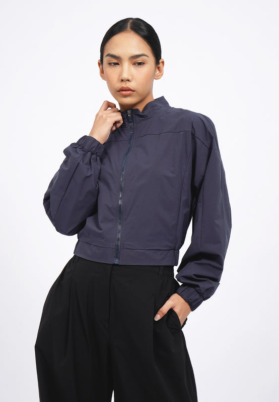 Active crop jacket, High neck, Full zip opening, Crop length, Quick dry fabric, Material: Polyester, Fit: Regular, Color: Navy, Model info: Model Wearing Size S for Top, Size S for Pants, Model Height 165 cm, Bust: 86 cm, Waist: 63 cm, Hips: 78 cm