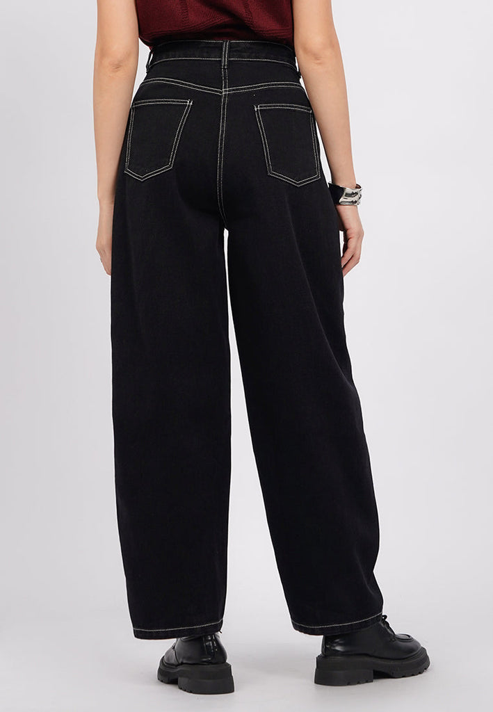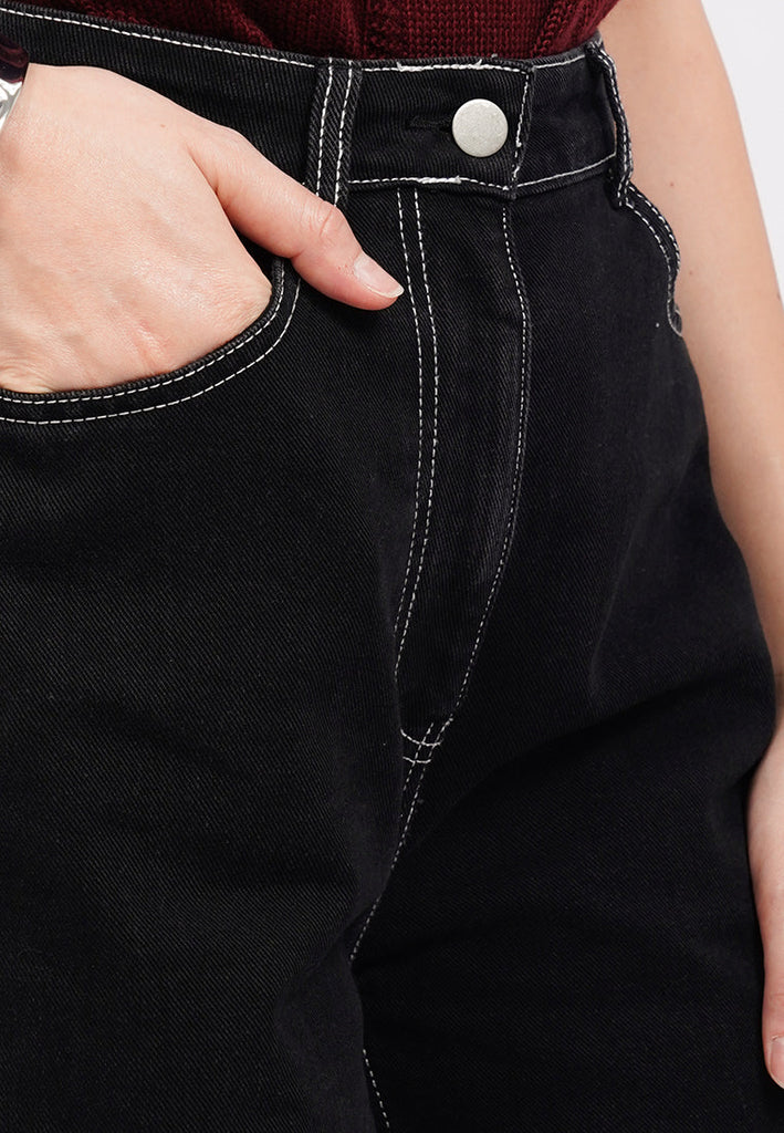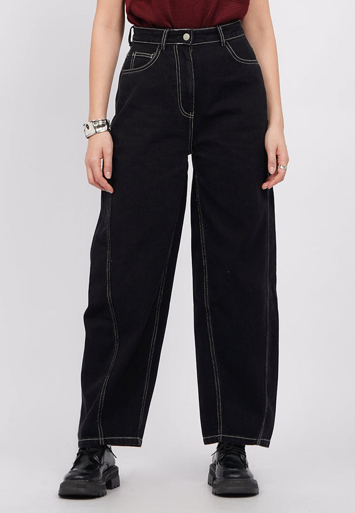Celana panjang denim, Barrel leg, Contrast stitching details, Double front and back pocket, Material: Denim, Fit: Barel, Color: Black, Model info: Model Wearing Size S, Height: 175cm, Bust: 89, Waist: 69, Hips: 89, Art: 5-LPDCAS225J007