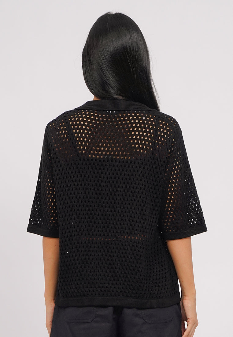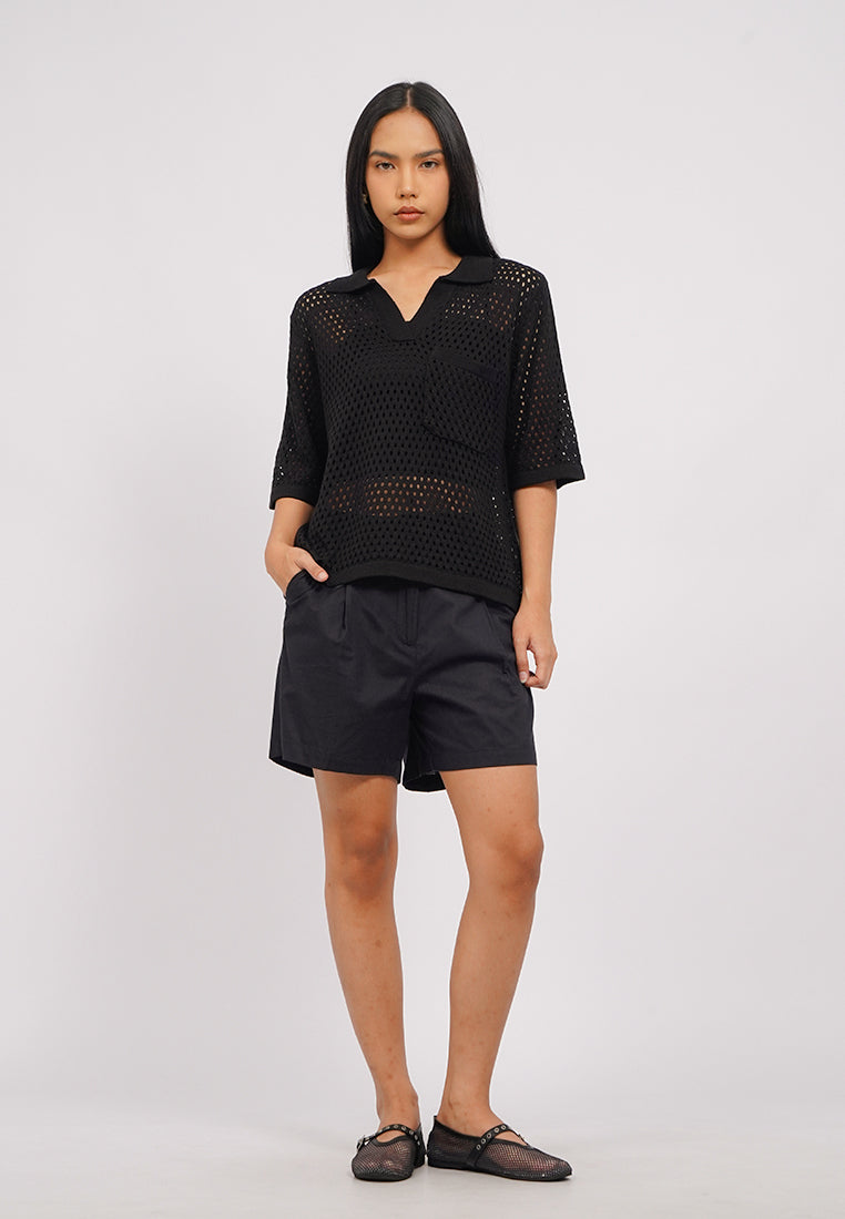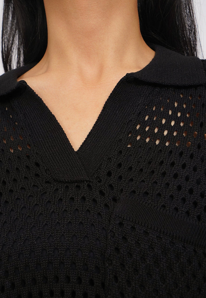 Atasan lengan pendek, V-neck with polo collar, Open work knit fabric, Front pocket details, Material: Cotton Acrylic, Fit: Regular, Color: Black, Model info: Model Wearing Size S, Model Height: 165 cm, Bust: 86 cm, Waist: 63 cm, Hips: 78 cm, Art: 5-PSGKCA225J124