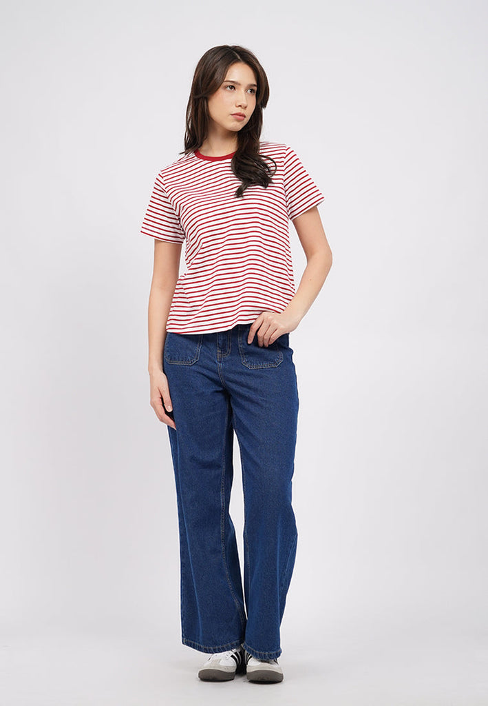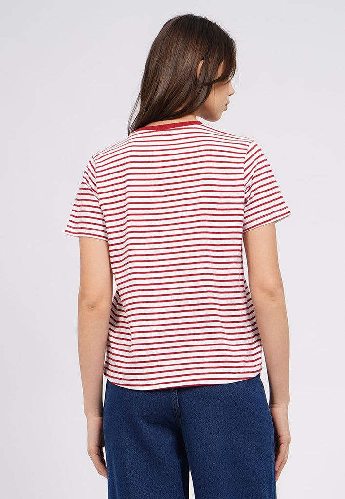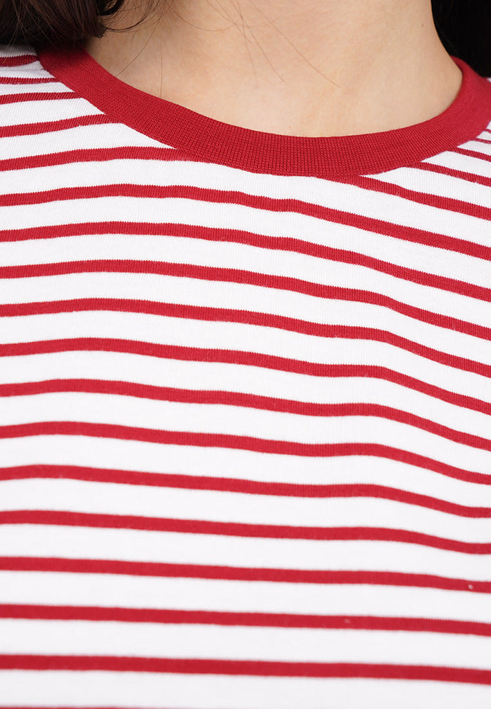 T-shirt lengan pendek, Contrast round neck, Stripes printed fabric, Material: Cotton, Fit: Regular, Color: Cherry, Model info: Model Wearing Size S, Height: 175cm, Bust: 89, Waist: 69, Hips: 89, Art: 5-TSKKCA225J173
