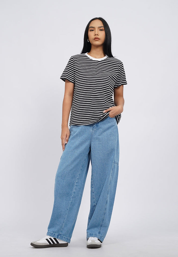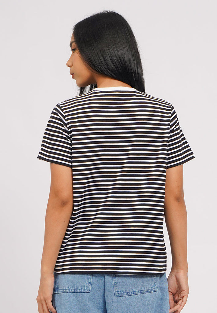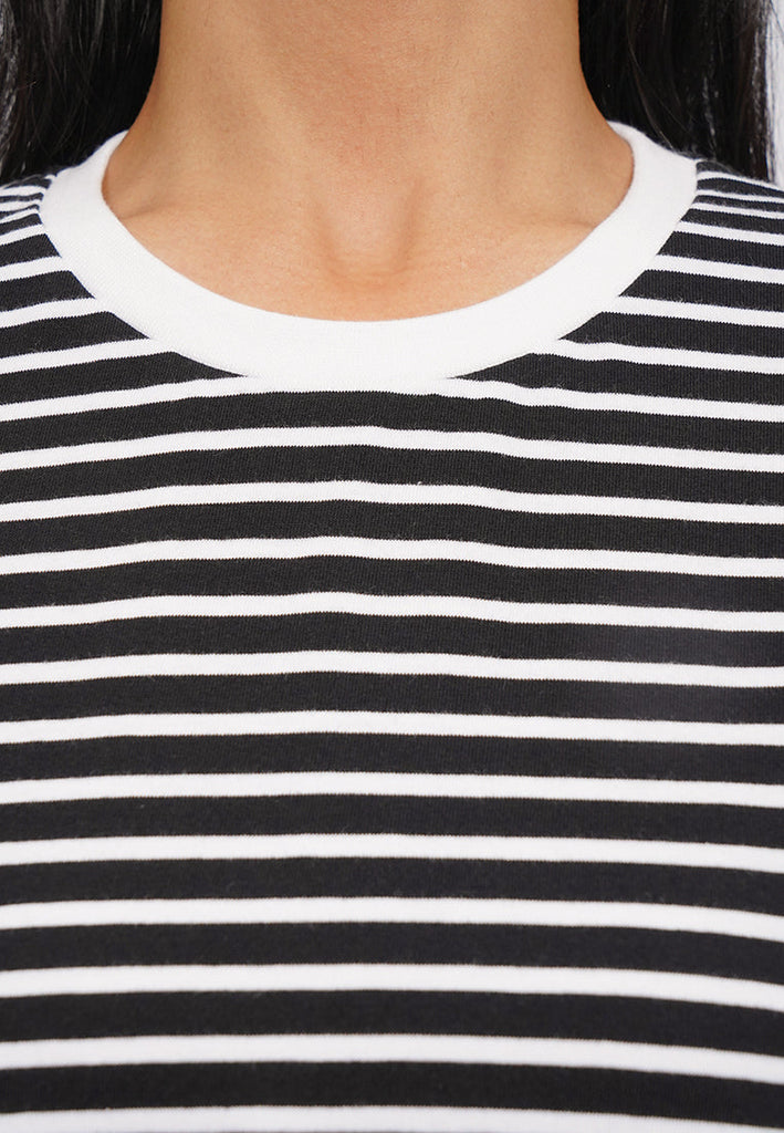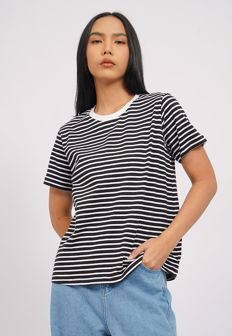 T-shirt lengan pendek, Contrast round neck, Stripes printed fabric, Material: Cotton, Fit: Regular, Color: Black, Model info: Model Wearing Size S, Model Height: 165 cm, Bust: 86 cm, Waist: 63 cm, Hips: 78 cm, Art: 5-TSKKCA225J171