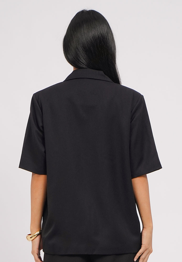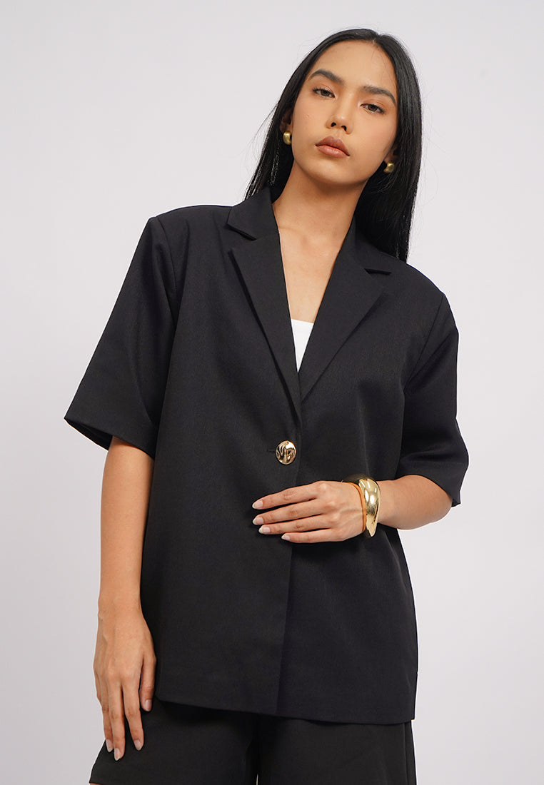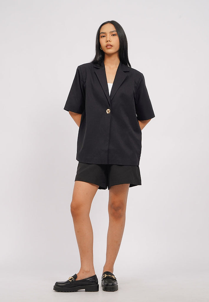 Blazer lengan pendek, V-neck with lapel, Single front button opening, Oversized cut, Material: Twill, Fit: Regular, Color: Black, Model info: Model Wearing Size S, Model Height: 165 cm, Bust: 86 cm, Waist: 63 cm, Hips: 78 cm, Art: 5-BZWKSG225J058