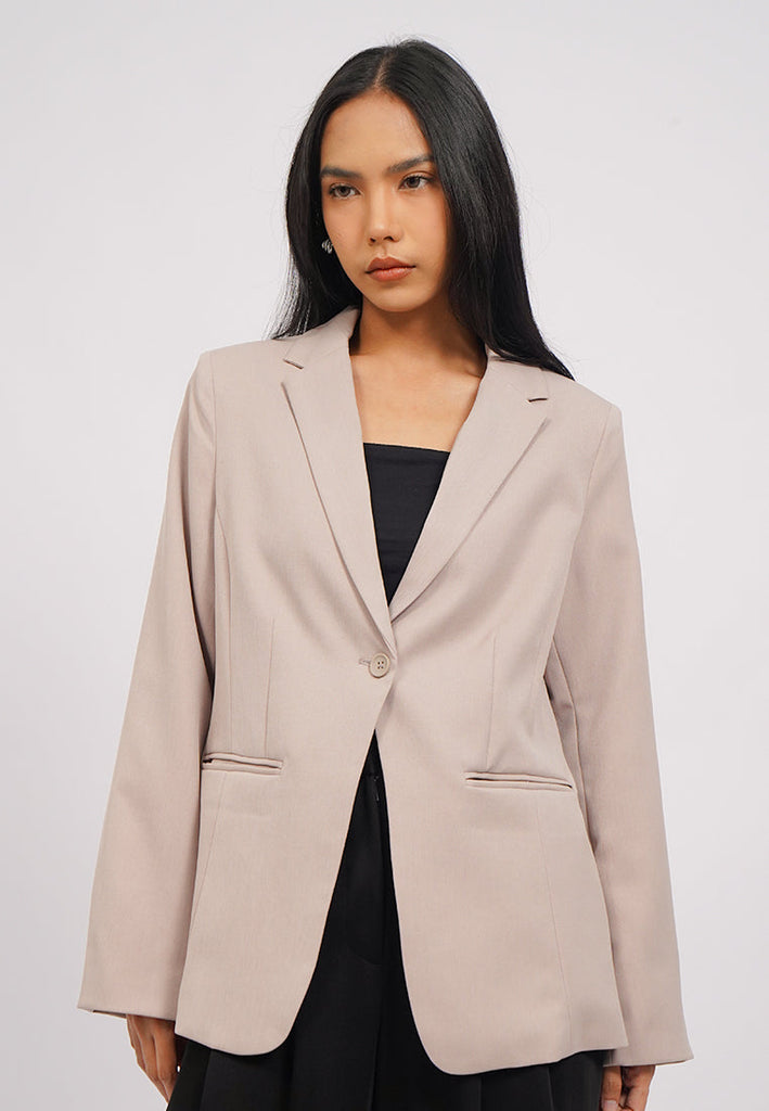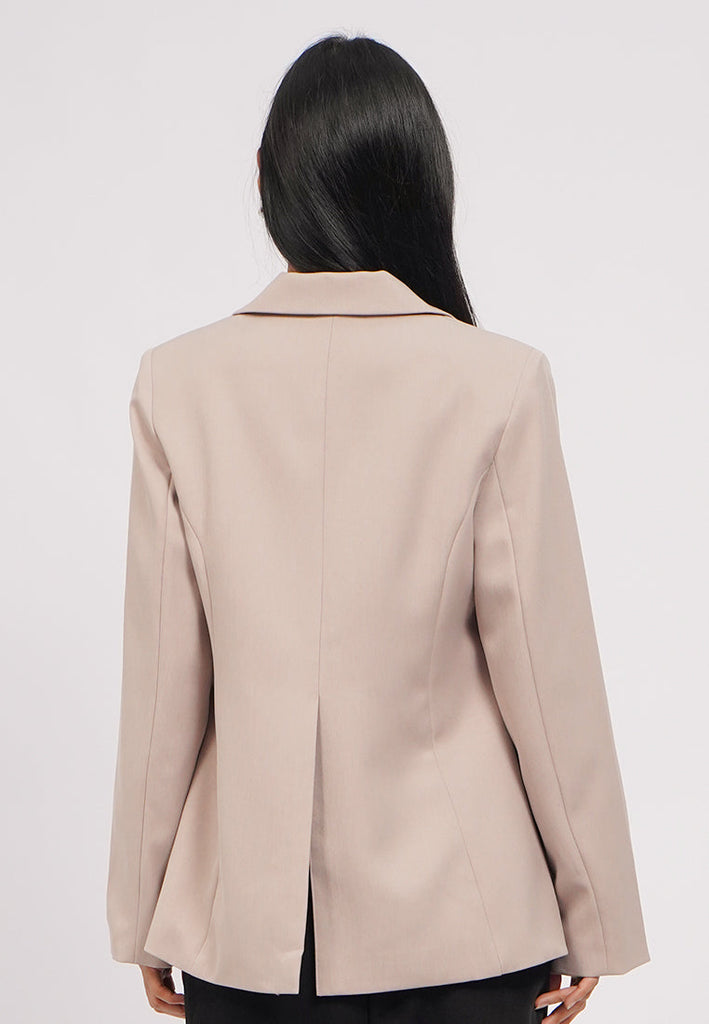 Blazer lengan panjang, V-neck with lapel, Double flap pocket, Front button opening, Back slit details, Material: Twill, Fit: Regular, Color: Taupe, Model info: Model Wearing Size S, Model Height: 165 cm, Bust: 86 cm, Waist: 63 cm, Hips: 78 cm, Art: 5-BZWKSG225J205