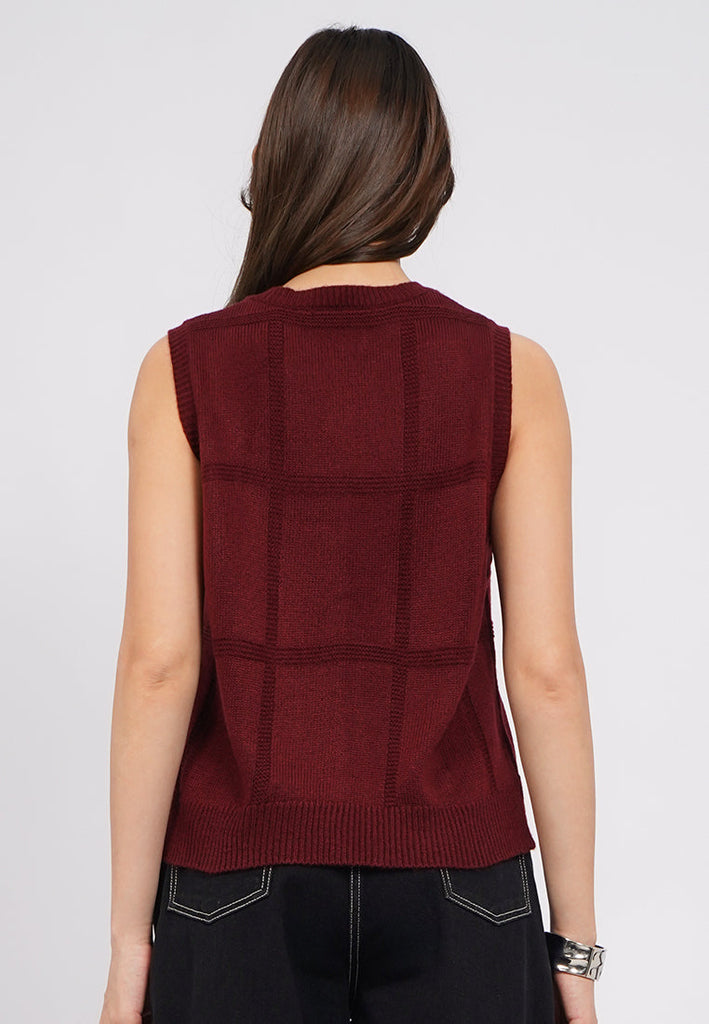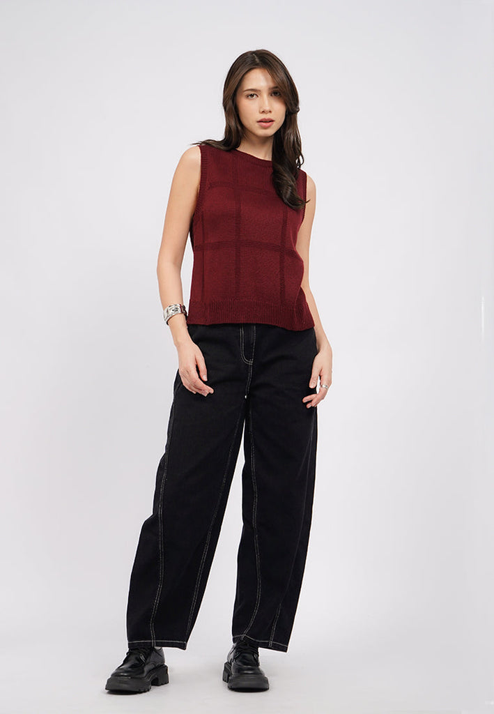 Atasan tanpa lengan, Round neck, Windowpane textured fabric, Material: Flat Knit, Fit: Regular, Color: Berry, Model info: Model Wearing Size S, Height: 175cm, Bust: 89, Waist: 69, Hips: 89, Art: 5-VEGCAS225J006