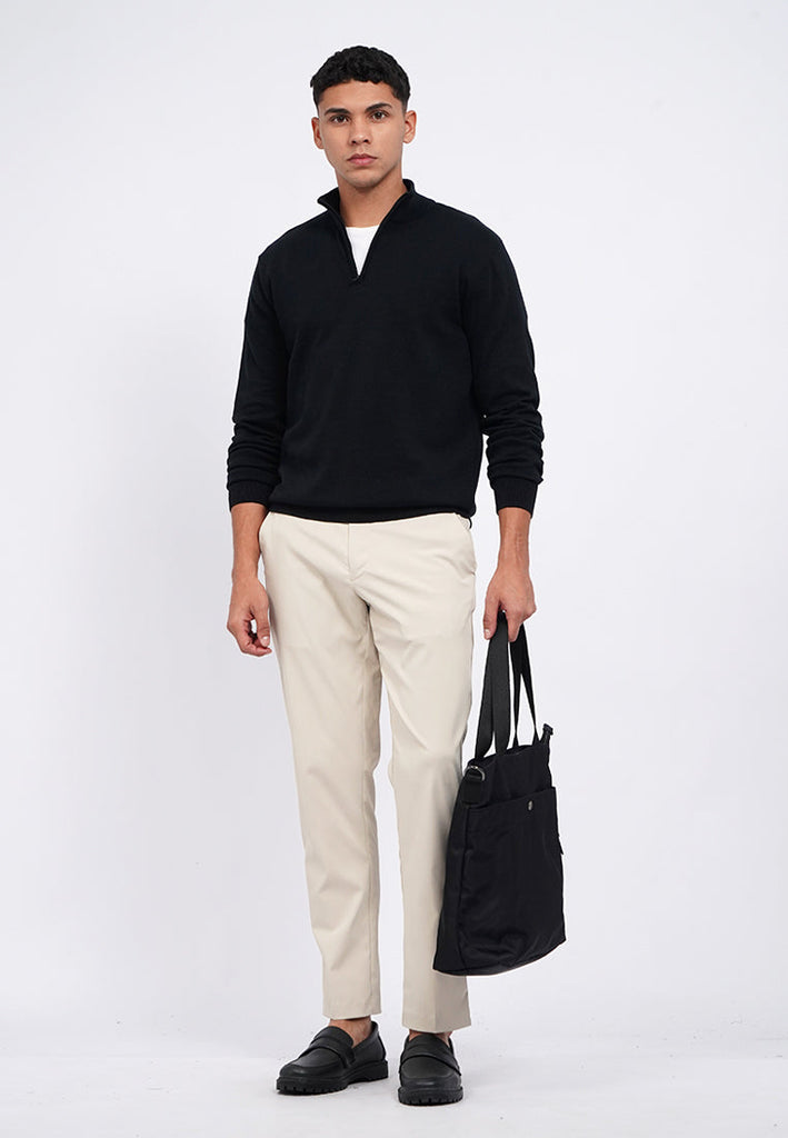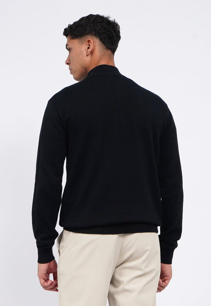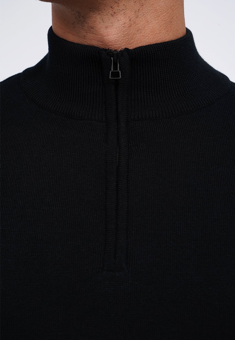 Sweater lengan panjang, Ribbed high neck, !/4 zip opening, Textured knit fabric, Material: Acrylic Knit, Fit: Slim, Color: Black, Model info: Model Wearing Size M, Height: 182 cm, Chest: 94 cm, Waist: 75 cm, Hips: 96 cm