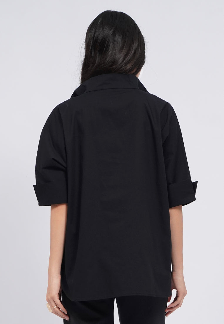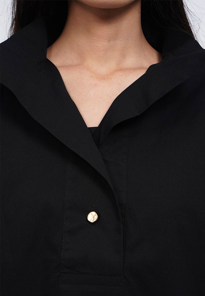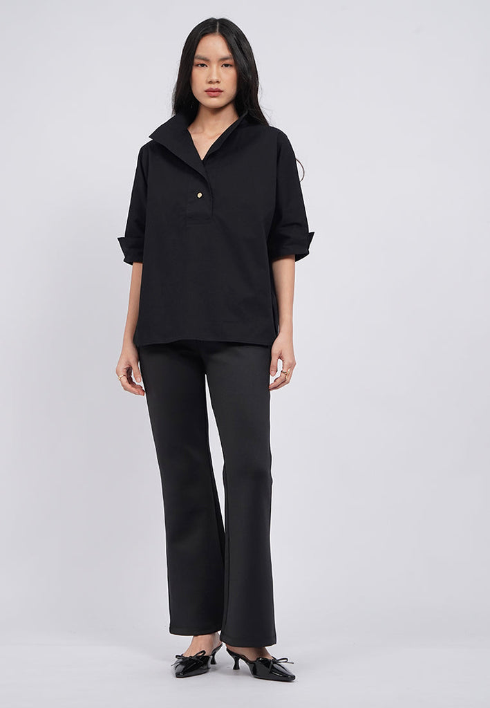 Blouse lengan 3/4, Open high collar, Gold button details, Folded sleeves, Material: Cotton, Fit: Oversized, Color: Black, Model info: Model Wearing Size S, Height: 168cm, Bust: 74cm, Waist: 62cm, Hips: 86cm