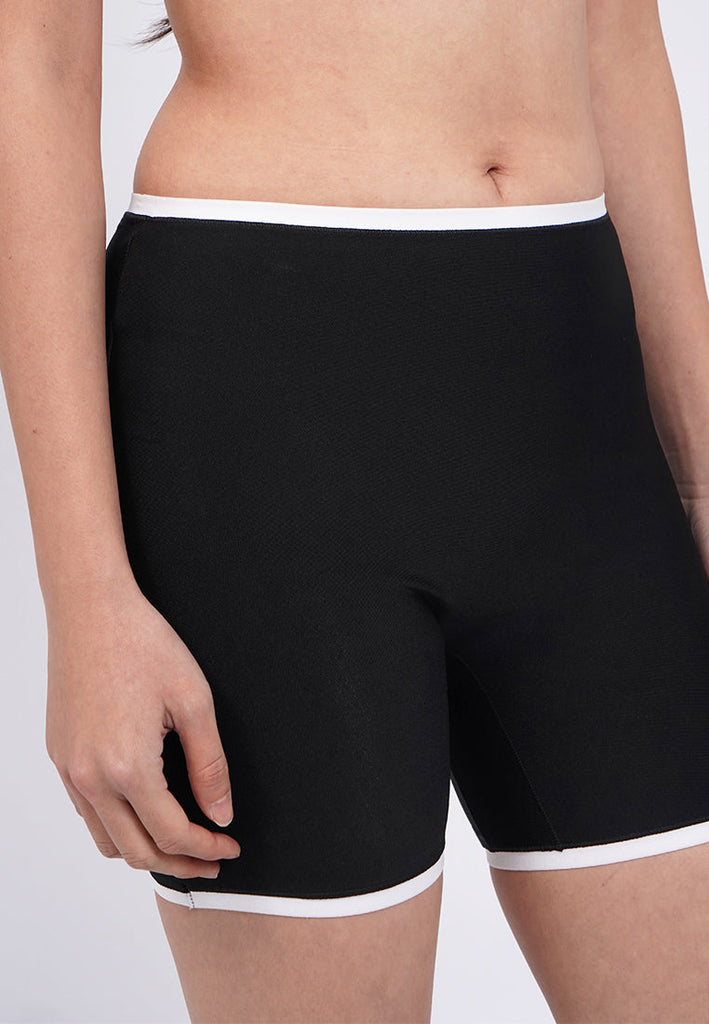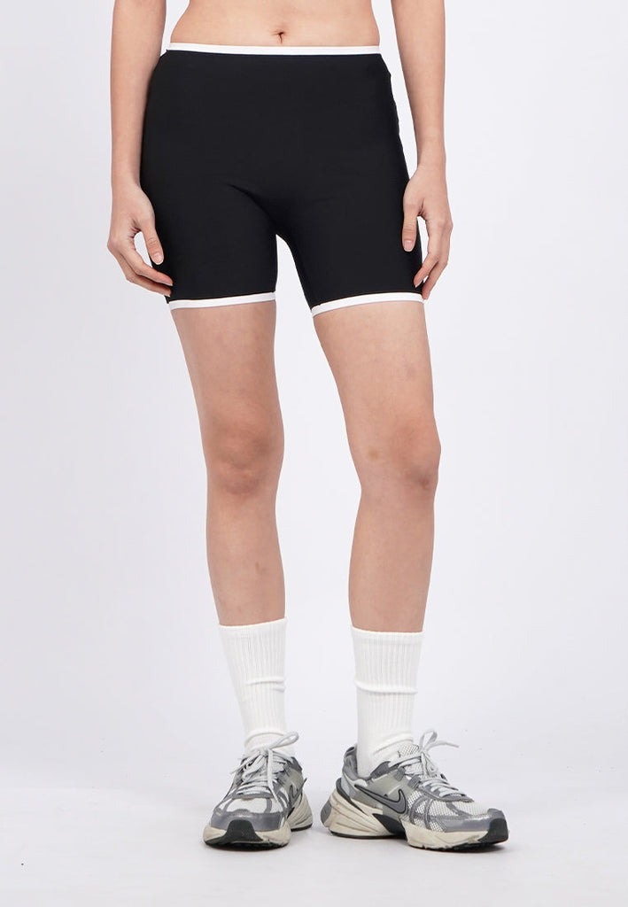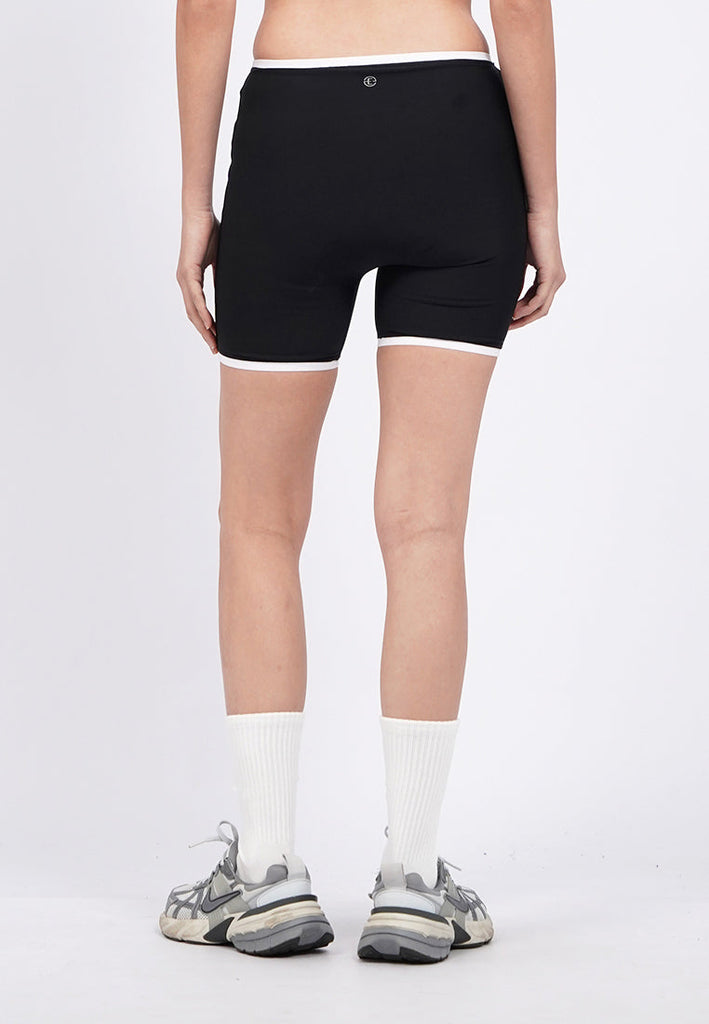 Short legging for sports, Elastic waist, Contrast lining details, 5" inseam, Material: Poly Spandex, Fit: Fitted, Color: Black, Model info: Model Wearing Size S, Height: 168cm, Bust: 74cm, Waist: 62cm, Hips: 86cm