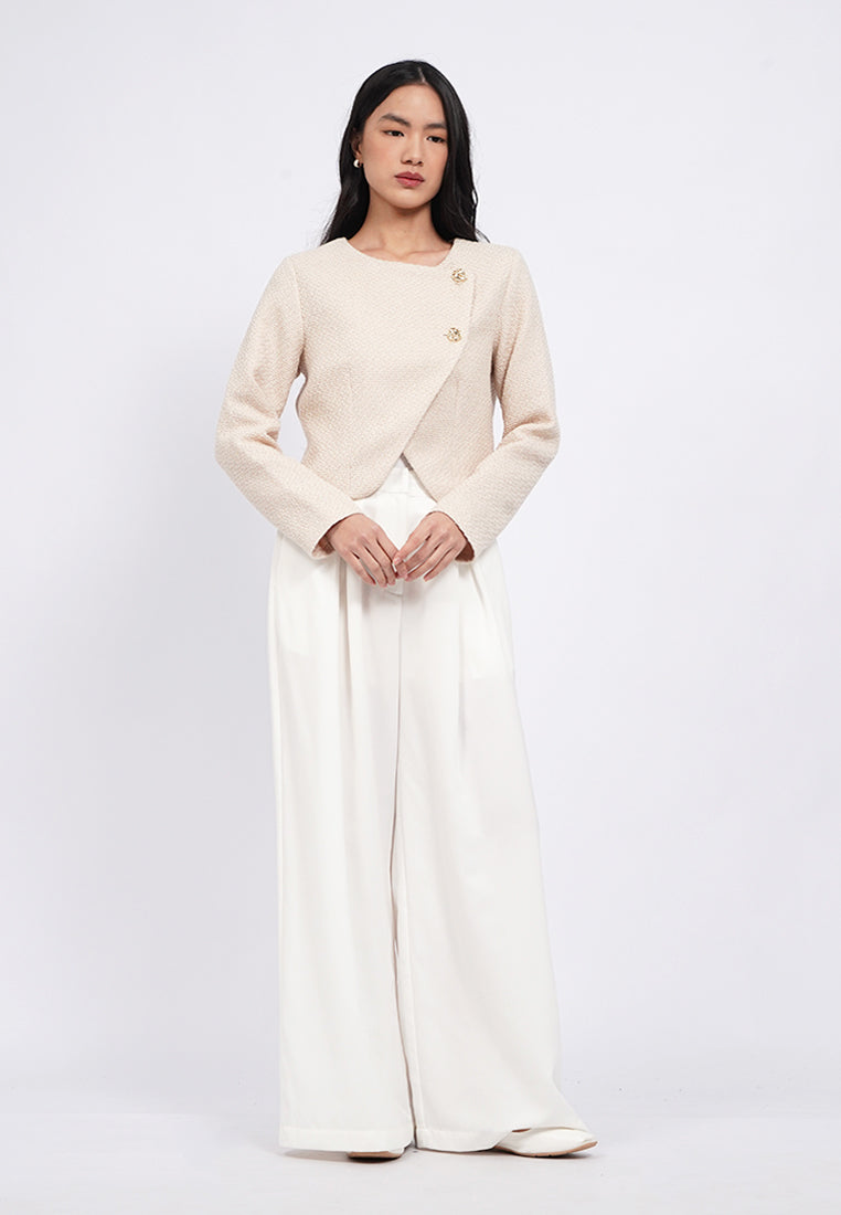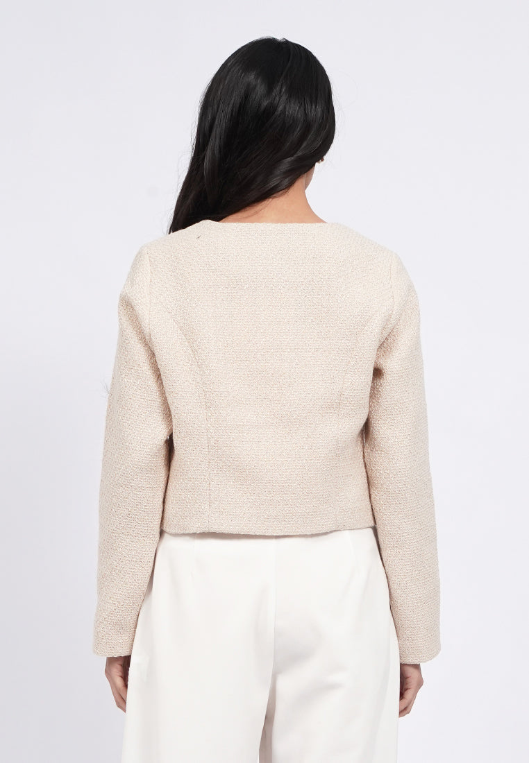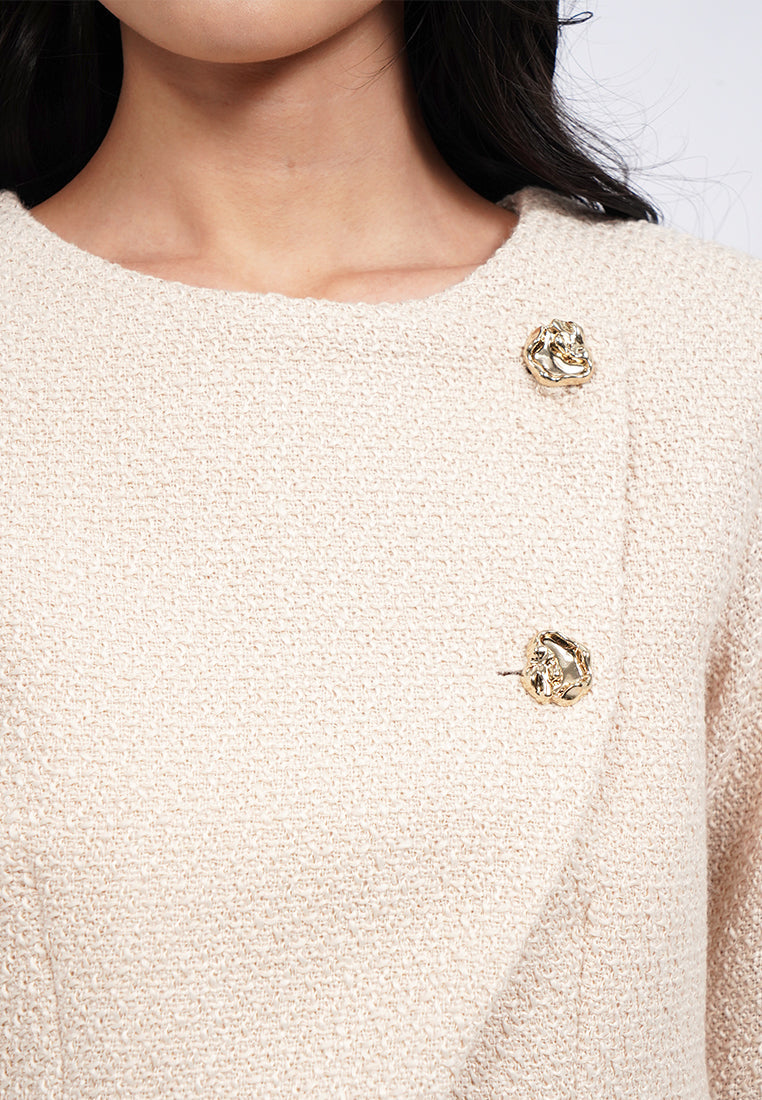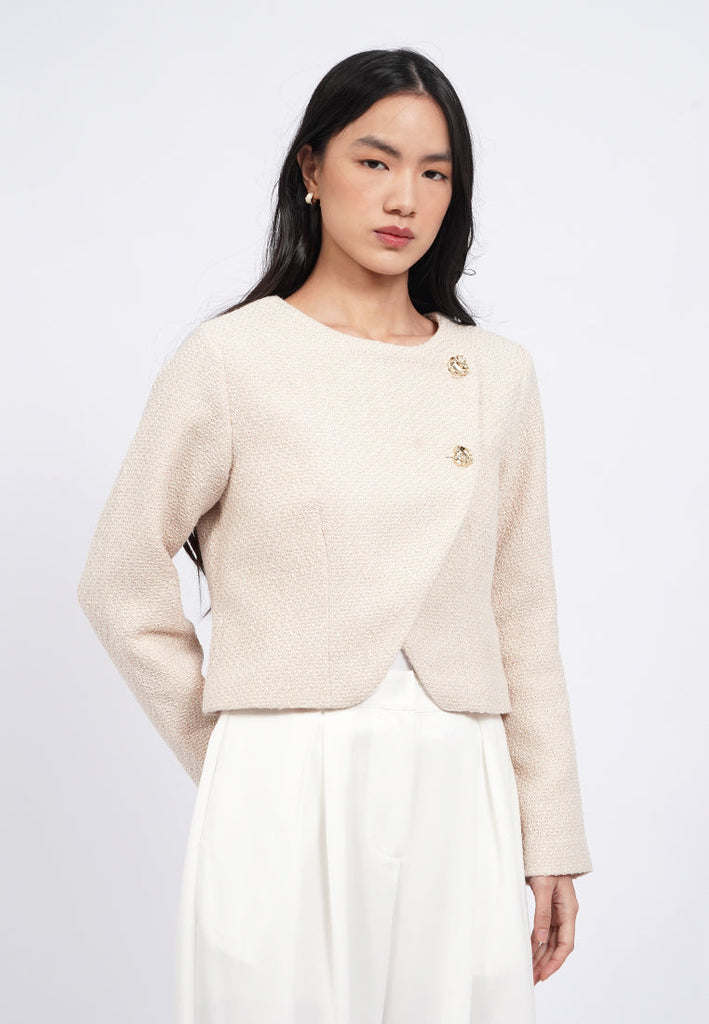 Blazer lengan panjang, Round neck, Asymmetrical front with button details, Textured fabric, Material: Tweed, Fit: Regular Crop, Color: Beige, Model info: Model Wearing Size S, Height: 168cm, Bust: 74cm, Waist: 62cm, Hips: 86cm