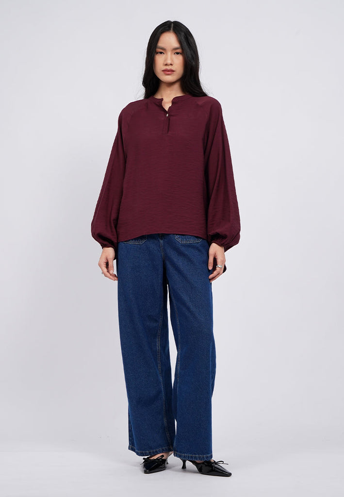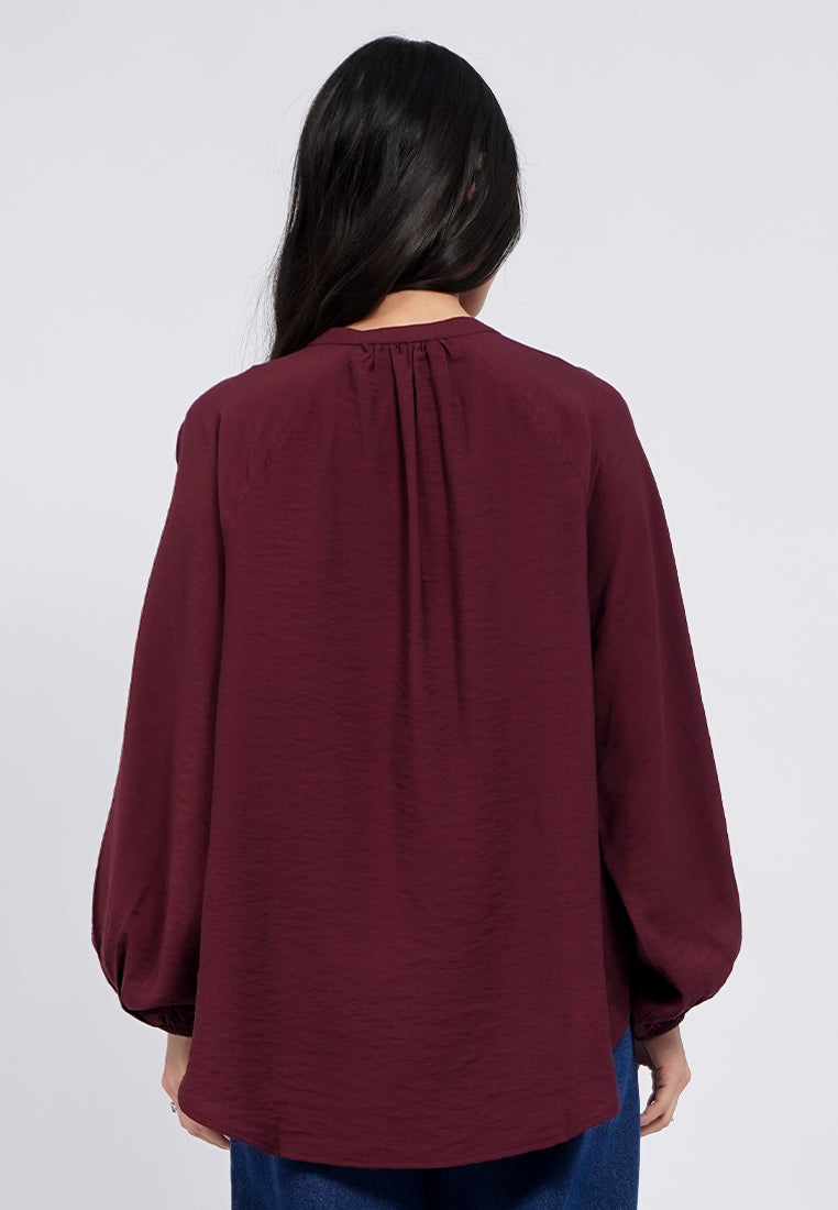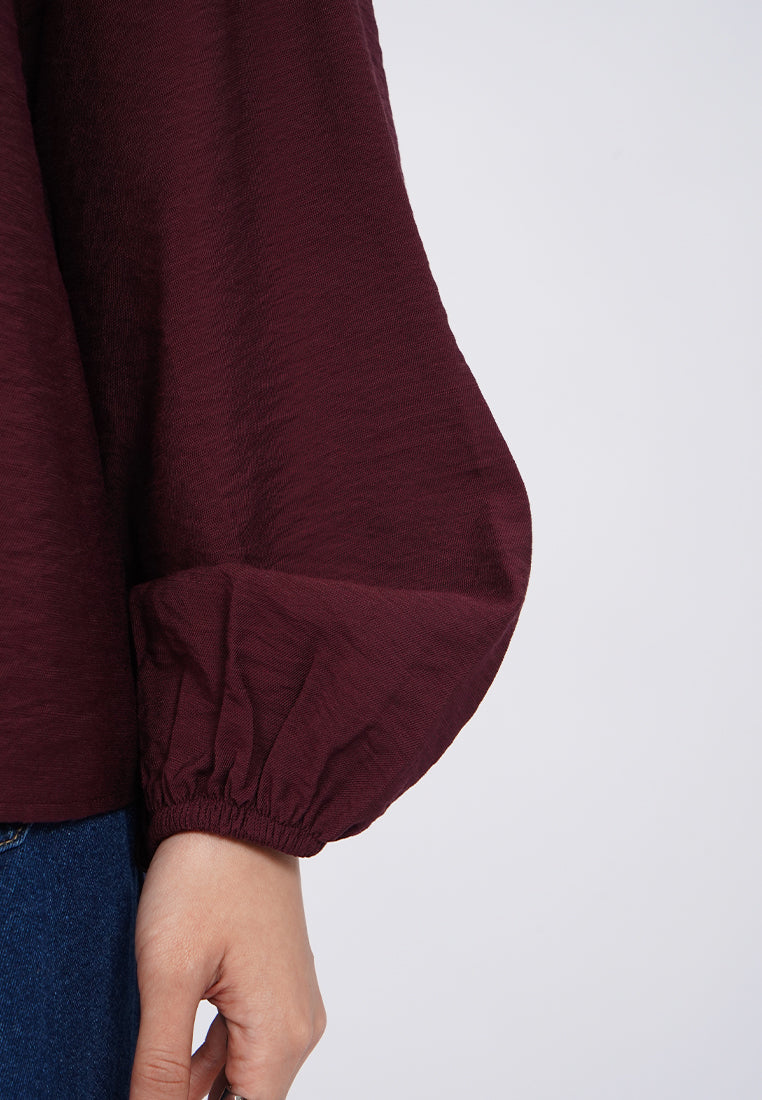 Blouse lengan panjang, Round neck, Balloon sleeves, High low hemline details, Material: Rayon, Fit: Loose, Color: Burgundy, Model info: Model Wearing Size S, Height: 168cm, Bust: 74cm, Waist: 62cm, Hips: 86cm