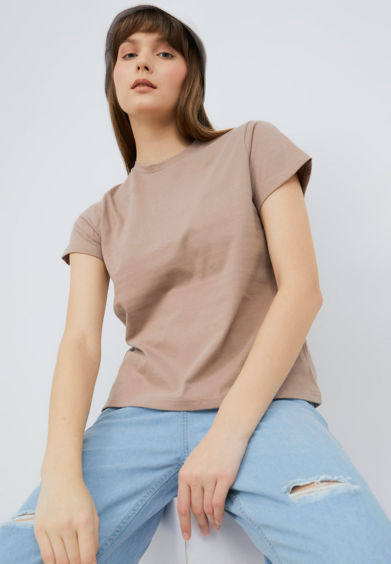 T-shirt lengan pendek, Kerah bulat, Regular length, Material: TC, FIT: REGULAR, Color: TAUPE, Model info: Model Wearing Size S for Top, Model Height 174 cm, Bust: 84 cm, Waist: 60 cm, Hips: 90 cm, Art: 5-TSKBBX222A005