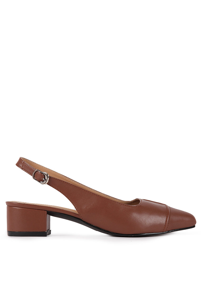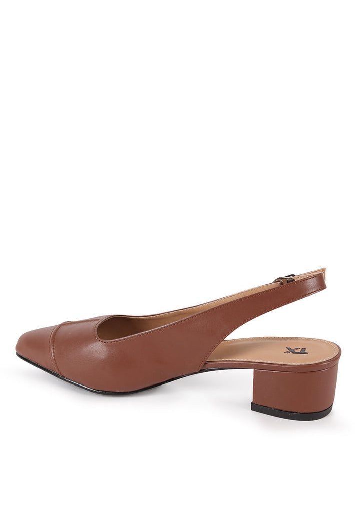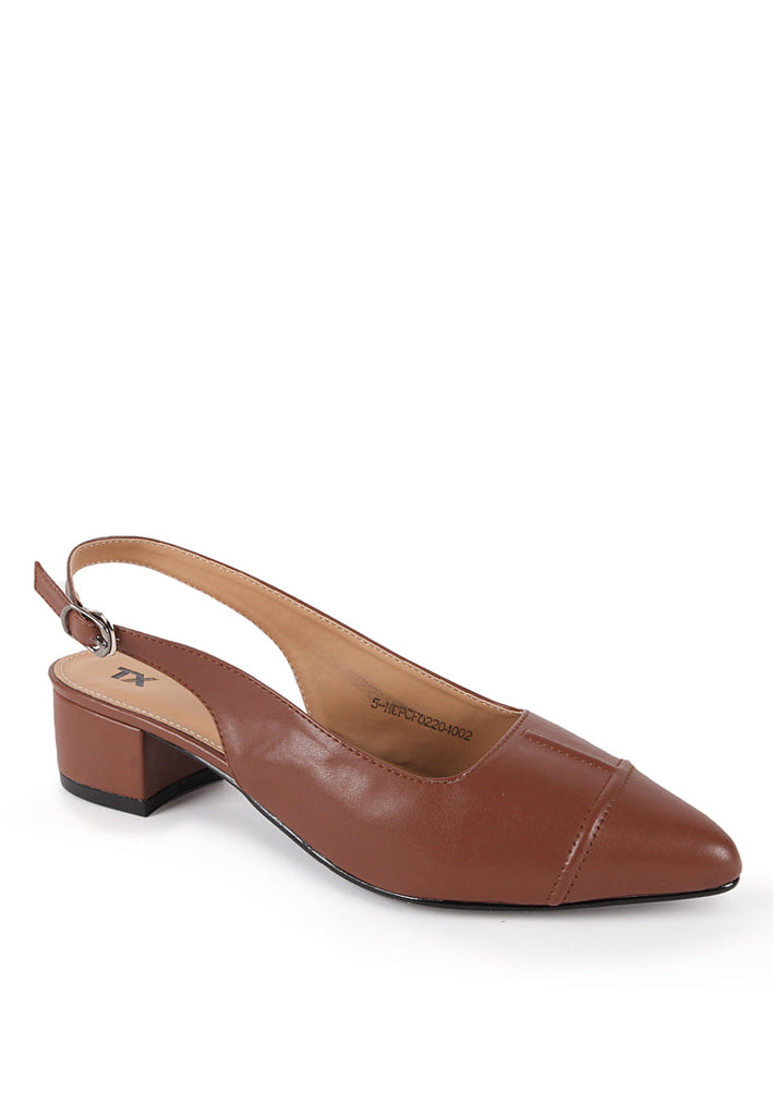 Sepatu dengan ujung runcing dilengkapi tali slingback dan heel, Material: Polyurethane, Color: Brown, Art: 5-HEPCFO220A002
