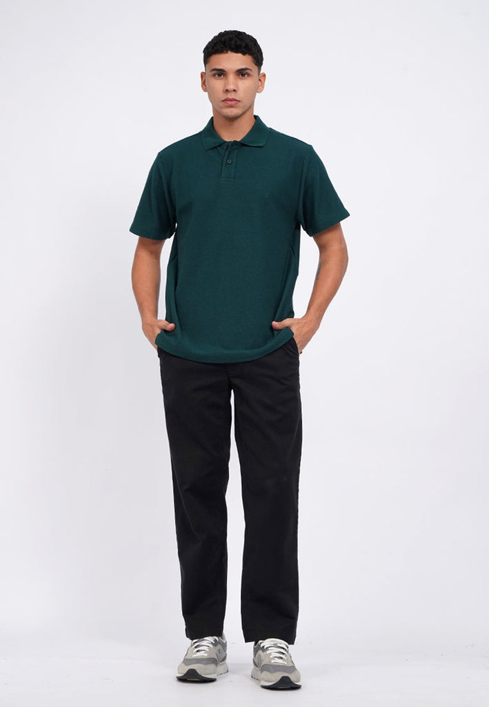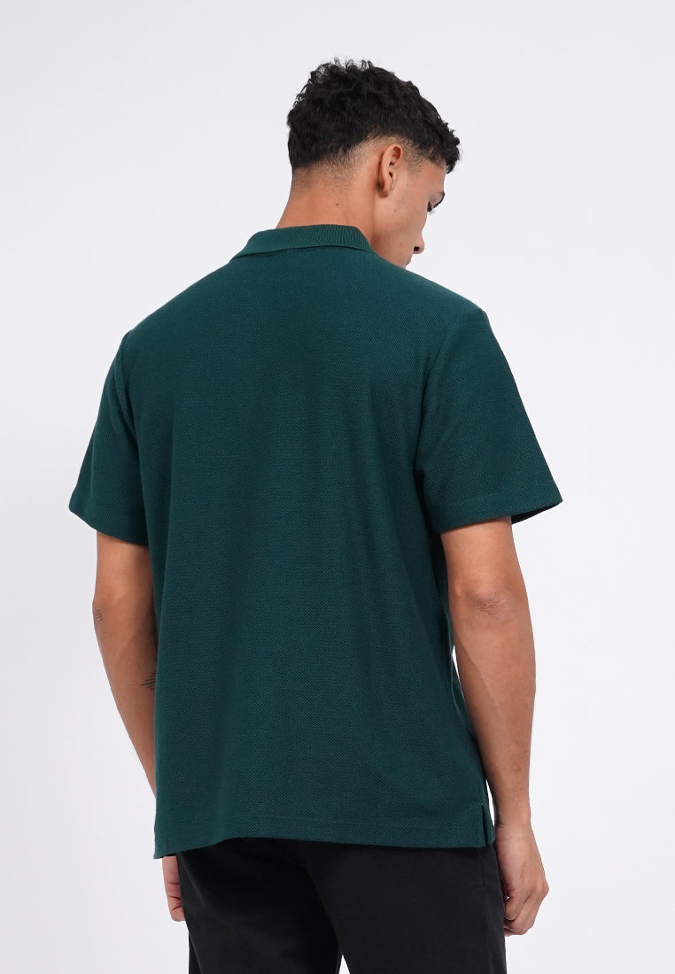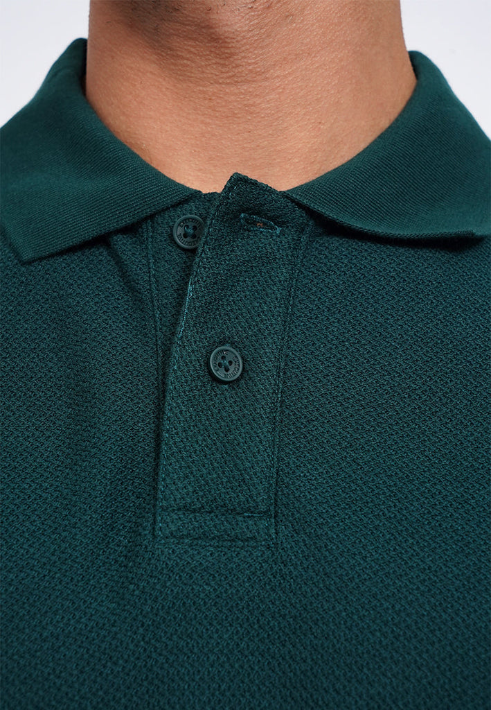 Atasan lengan pendek, Polo collar, Front button opening, Textured fabric, Material: CVC, Fit: Regular, Color: Bottle Green, Model info: Model Wearing Size M, Height: 182 cm, Chest: 94 cm, Waist: 75 cm, Hips: 96 cm