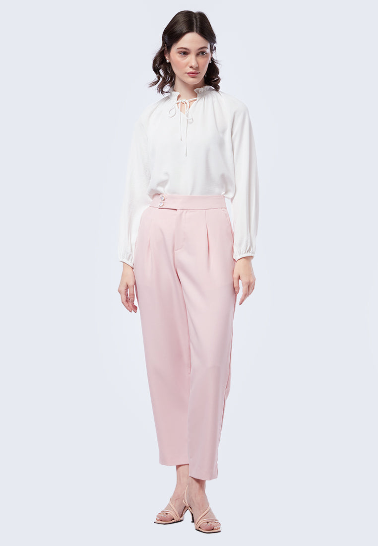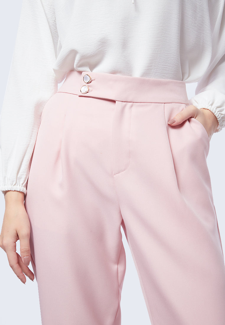 Celana panjang high waist, Front zipper with overlap button, Dengan kantong samping, Front pleat details, Material: Twill, Fit: Regular, Color: Soft Pink, Model info: Model Wearing Size S for Top, Size S for Pants, Model Height 176 cm, Bust: 84 cm, Waist: 60, Hips: 90 cm, Art: 5-LPWFEM223J065