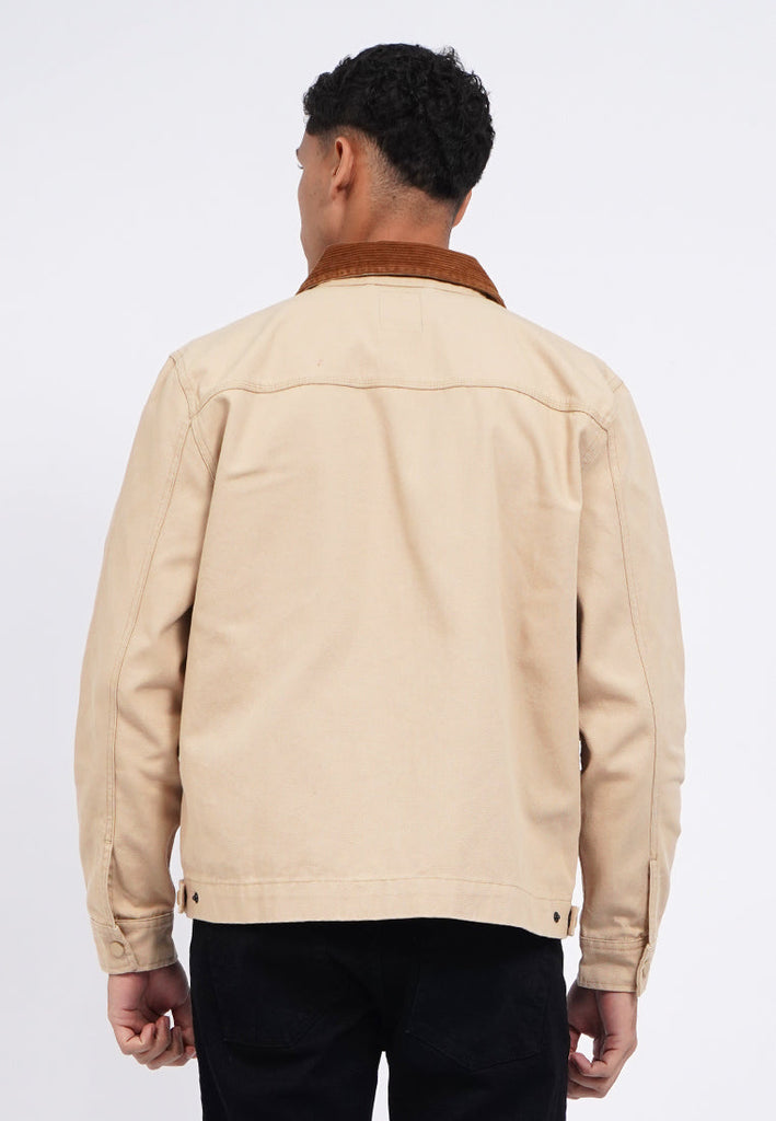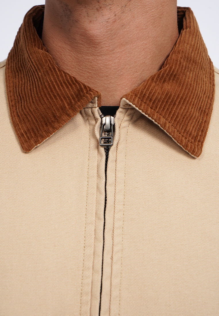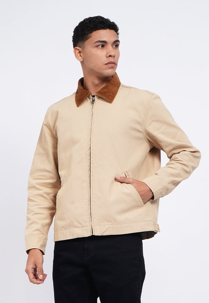 Jaket lengan panjang, Contrast collar details, Front zipper opening, Double front pocket, Material: Cotton - Canvas, Fit: Boxy, Color: Oat, Model info: Model Wearing Size M, Height: 182 cm, Chest: 94 cm, Waist: 75 cm, Hips: 96 cm