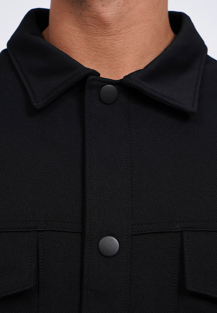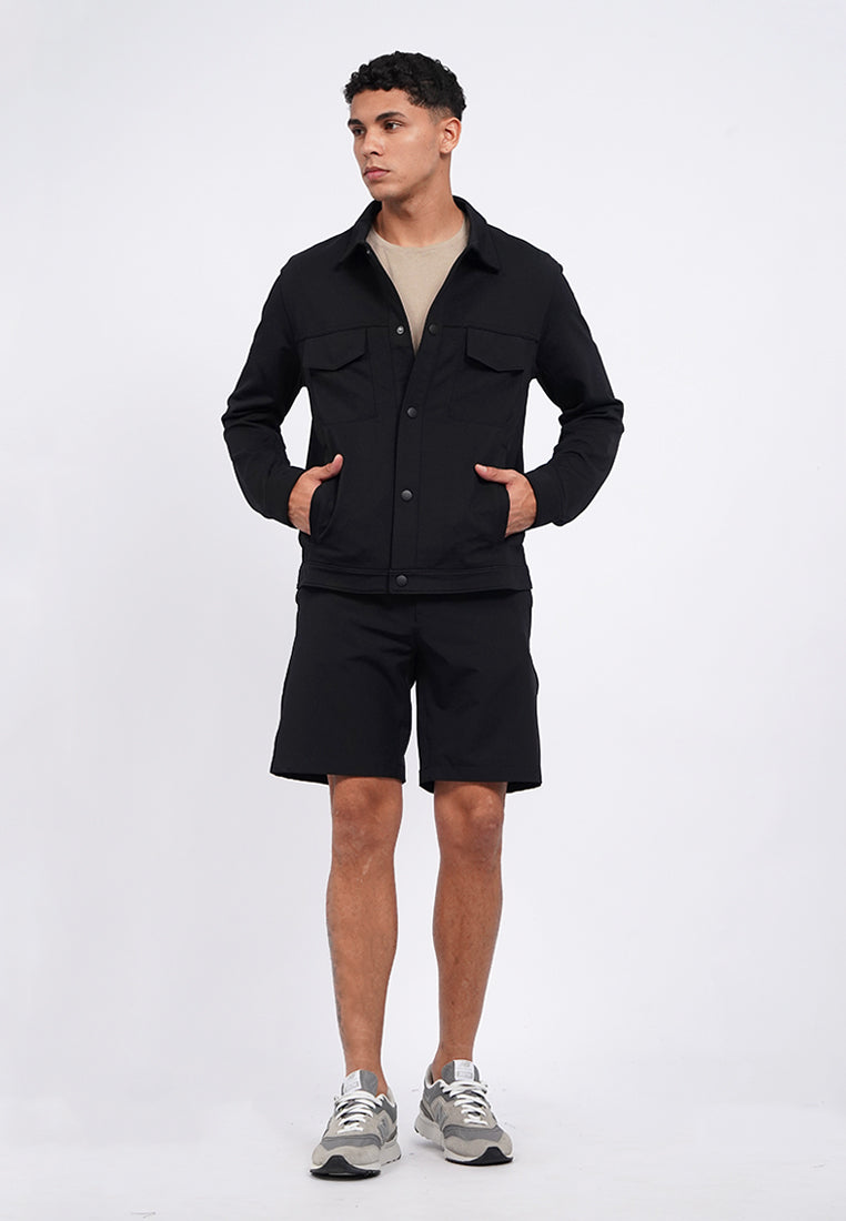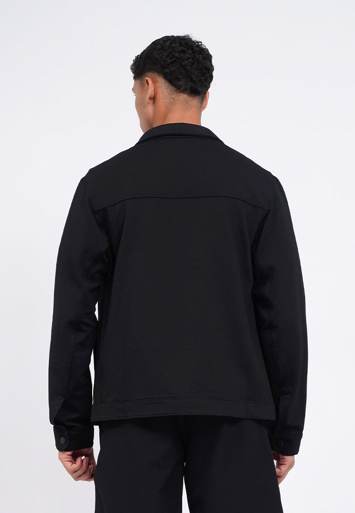 Long sleeve active jacket, 4-way stretch fabric, Double flap pocket details, Snap button opening, Material: Poly Spandex, Fit: Slim, Color: Black, Model info: Model Wearing Size M, Height: 182 cm, Chest: 94 cm, Waist: 75 cm, Hips: 96 cm
