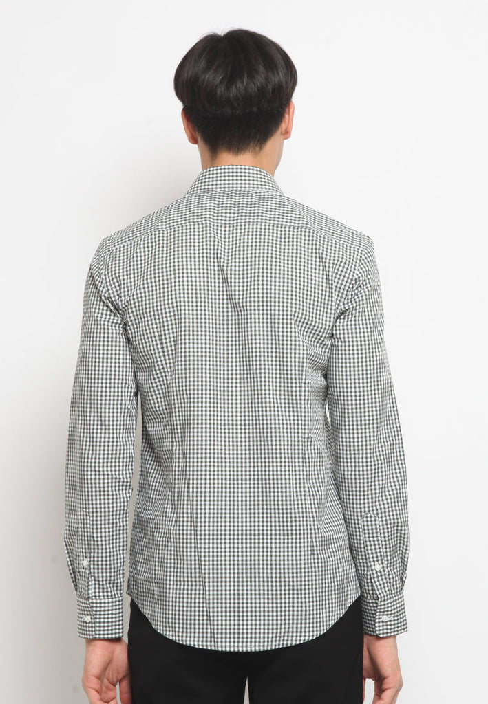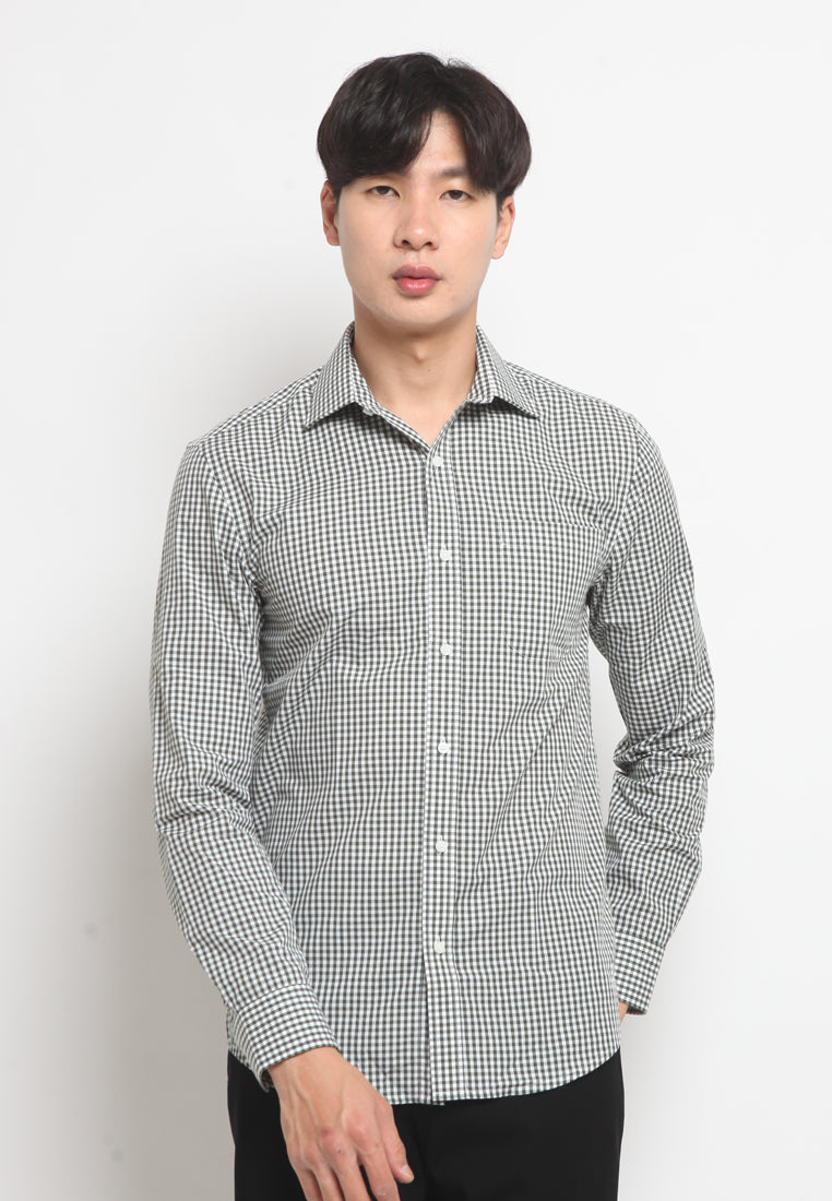 Kemeja lengan panjang, Micro check printed fabric, Rounded front pocket, Rounded hemline, Material: CVC, FIT: SLIM, Color: ARMY, Model info: Model Wearing Size 15.5 for Top, Model Height 184 cm, Bust: 91cm, Waist: 77cm, Hips: 97cm, Art: 1-LSICRO221B375