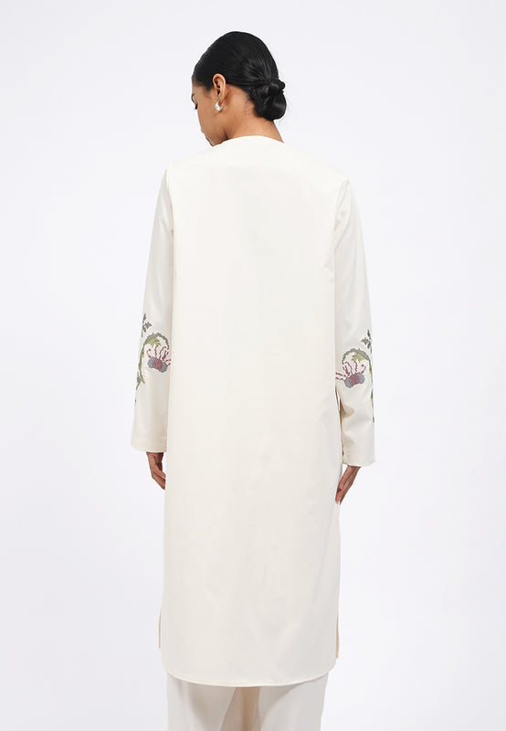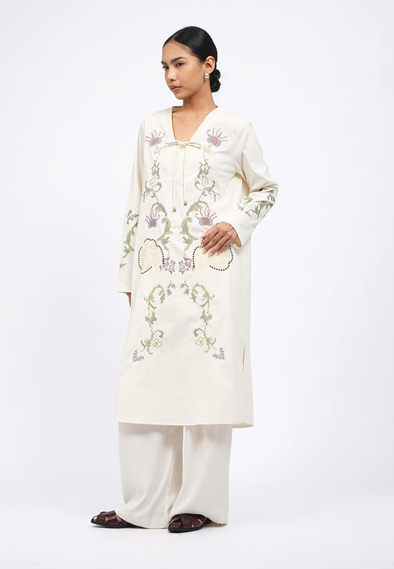 Midi dress lengan panjang, V-neck with adjustable tie, Contrast embroidery fabric, Material: Polyester, Fit: Loose, Color: Ecru, Model info: Model Wearing Size S for Top, Size S for Pants, Model Height 165 cm, Bust: 86 cm, Waist: 63 cm, Hips: 78 cm