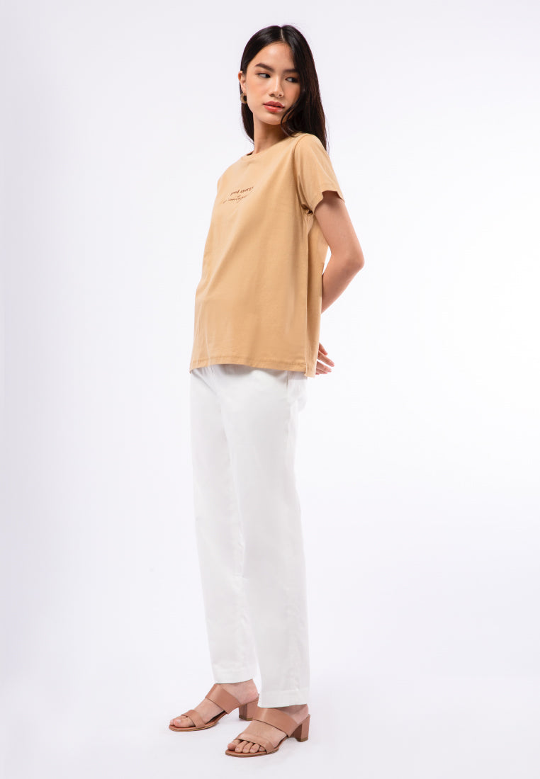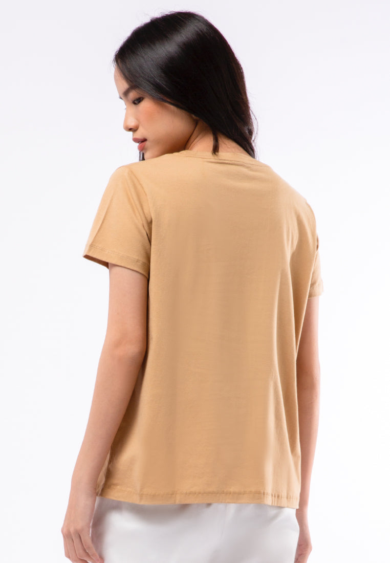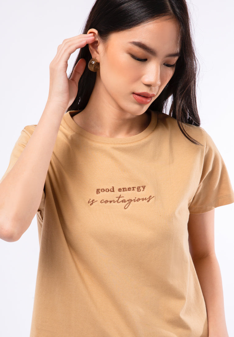 T-shirt lengan pendek, Kerah bulat, Detail bordir di bagian depan, Regular length, Material: Cotton Combed, Fit: Regular, Color: Tan, Model info: Model Wearing Size S for Top, Model Height 168 cm, Bust: 75 cm, Waist: 63 cm, Hips: 90 cm, Art: 5-TSKKCA122F025