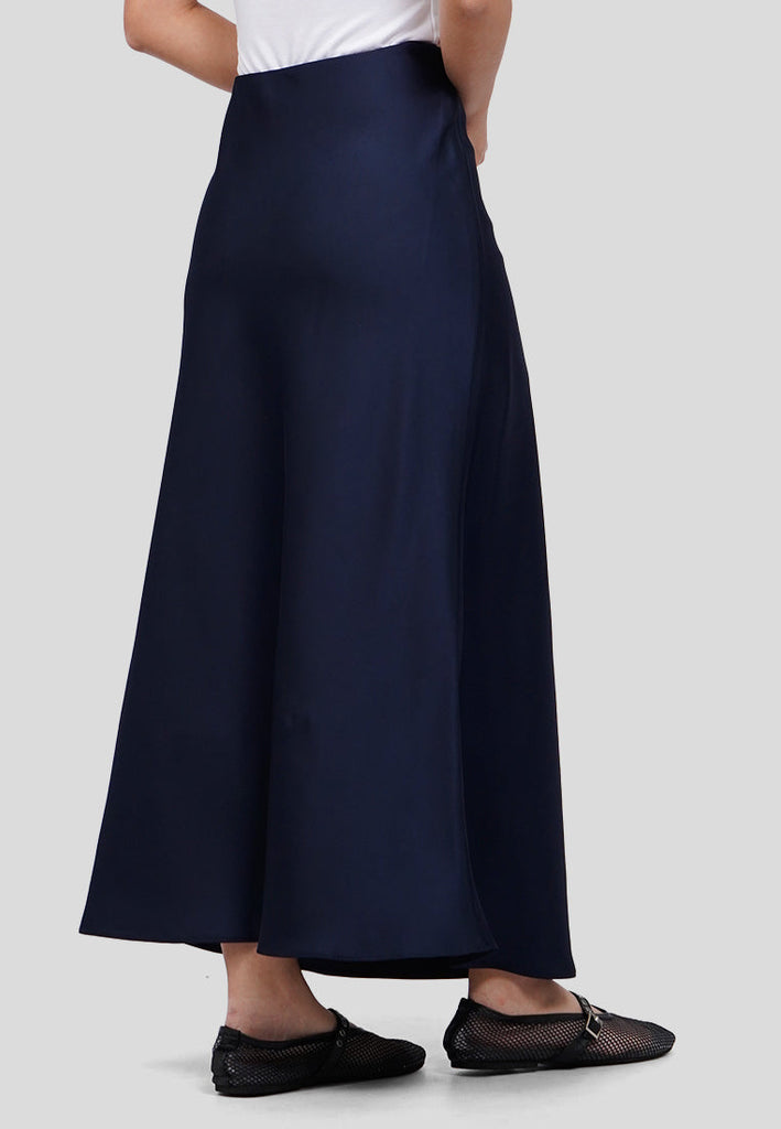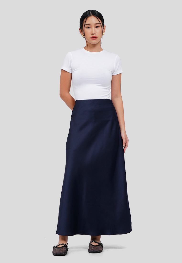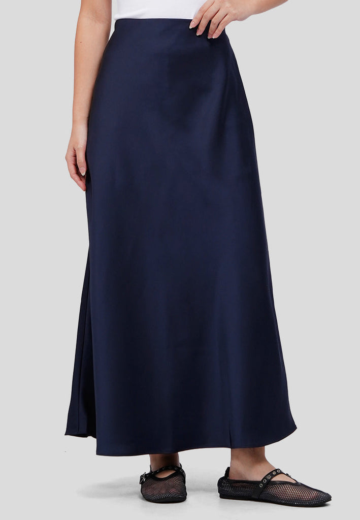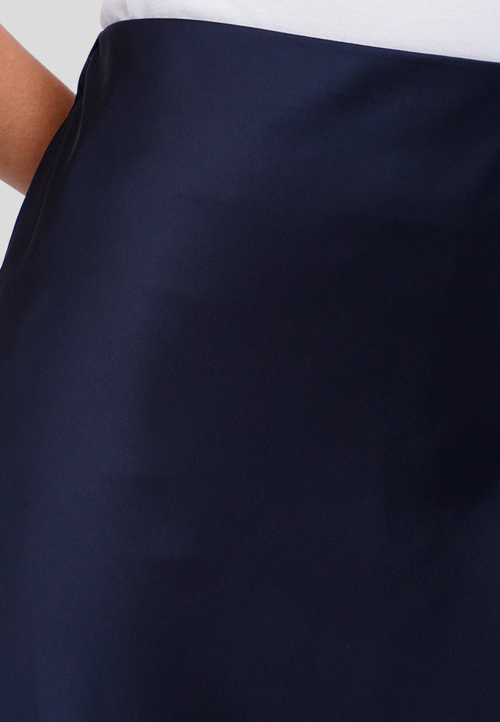 Medium length skirt, A-line cut, Silky finished fabric, Material: Satin Silk, Fit: Regular, Color: Navy, Model info: HEIGHT: 165CM, BUST: 82, WAIST: 63, HIPS: 83, Art: 5-SXWKSG225I040
