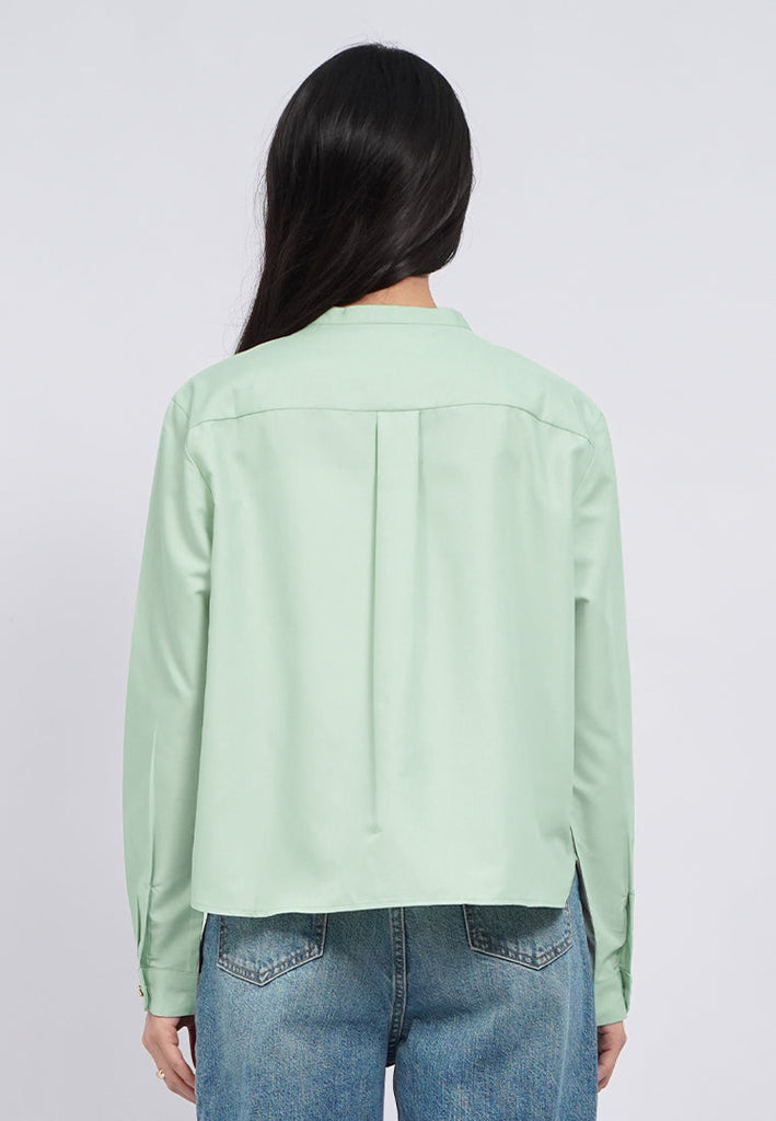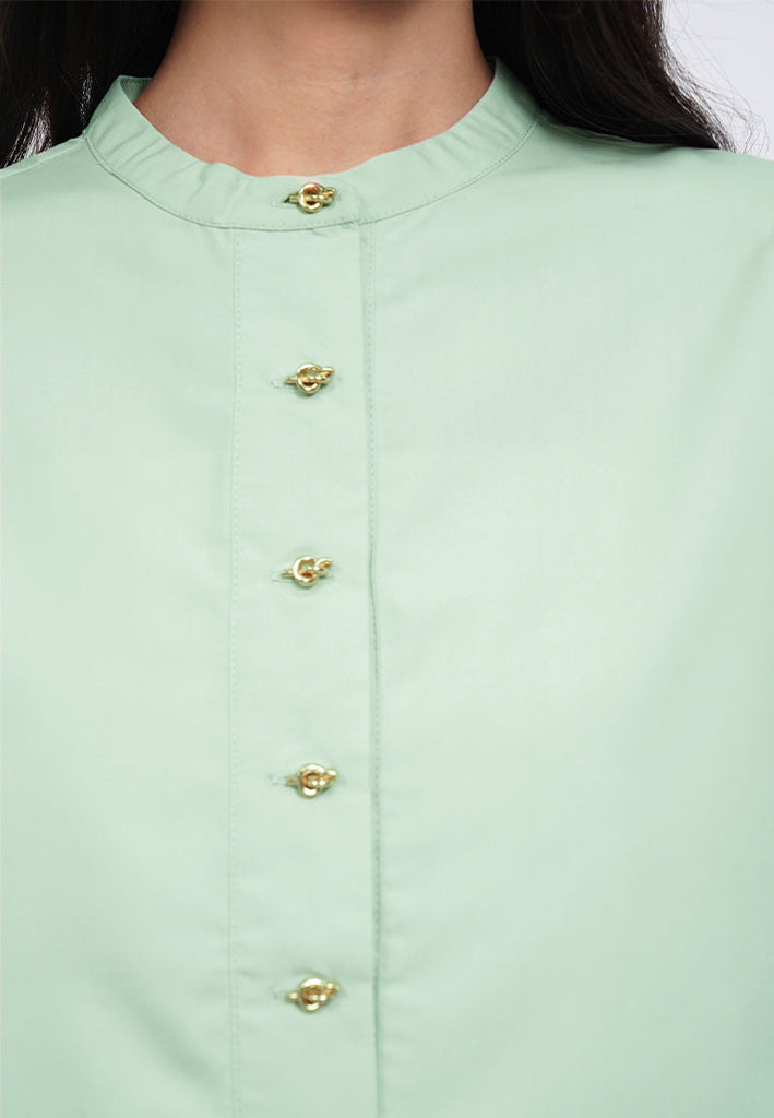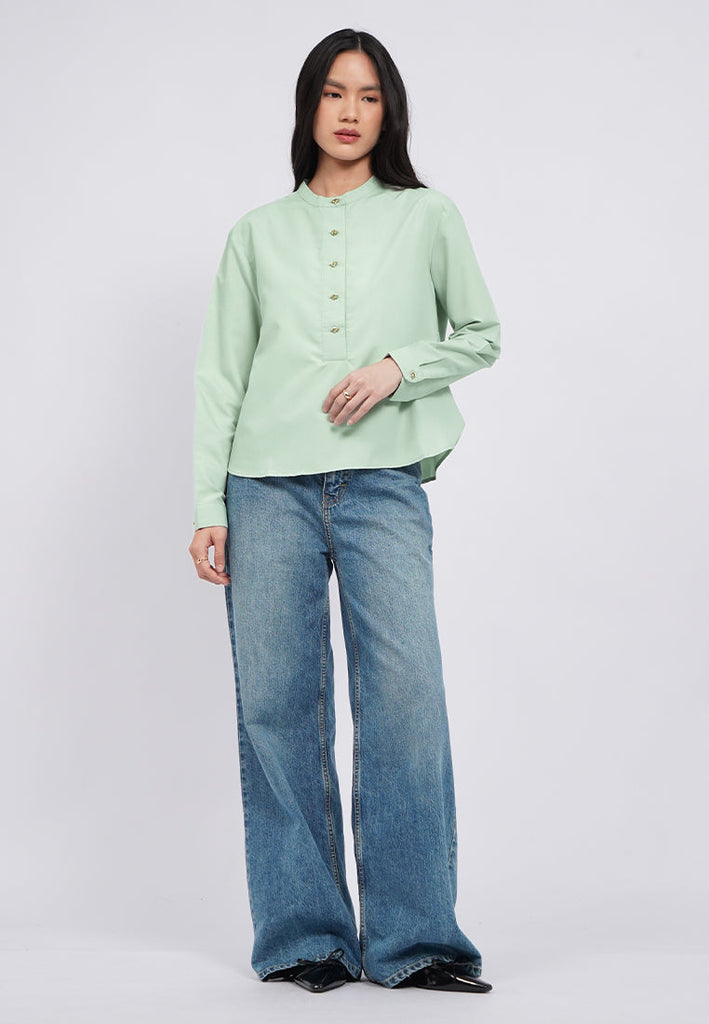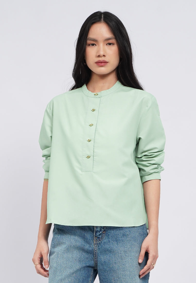 Blouse lengan panjang, Round neck, Fancy gold button opening, Back pleat details, Material: Polyester, Fit: Loose, Color: Sage, Model info: Model Wearing Size S, Height: 168cm, Bust: 74cm, Waist: 62cm, Hips: 86cm