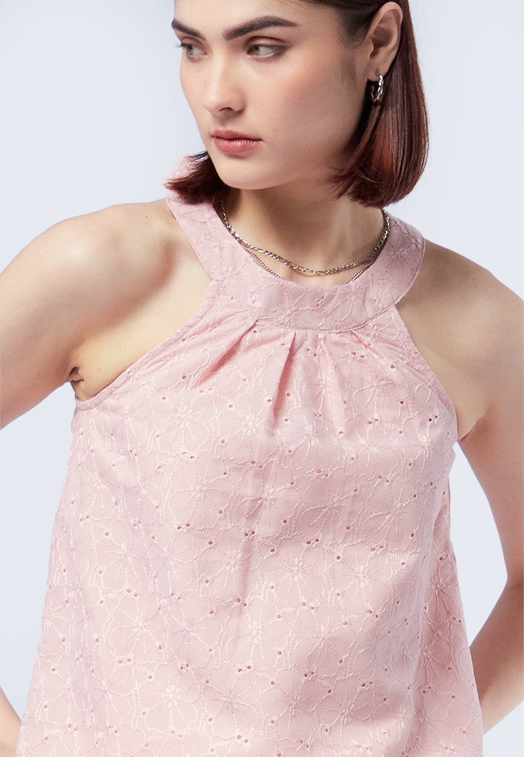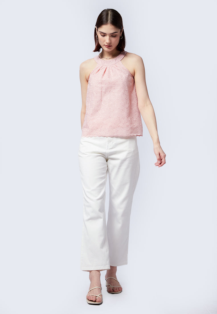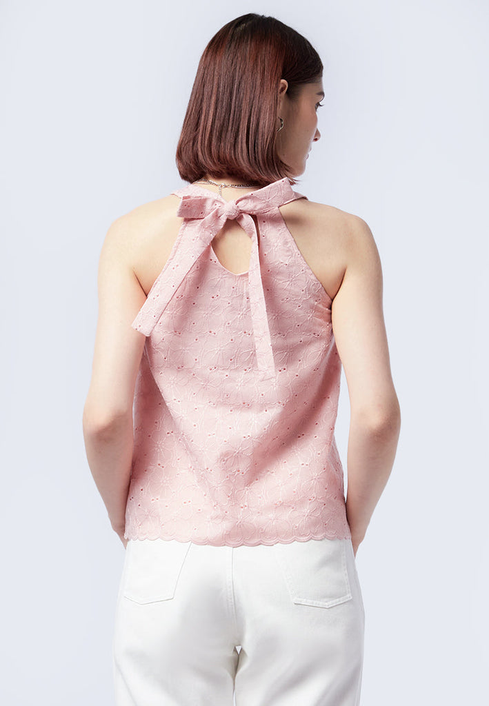 Atasan tanpa lengan, Halter neck, Tied back with ribbon details, Textured fabric, Material: Cotton Eyelet, Fit: Regular, Color: Soft Pink, Model info: Model Wearing Size S for Top, Size S for Pants, Model Height 175 cm, Bust: 84 cm, Hips: 90 cm, Art: 5-SLWKSG223L059