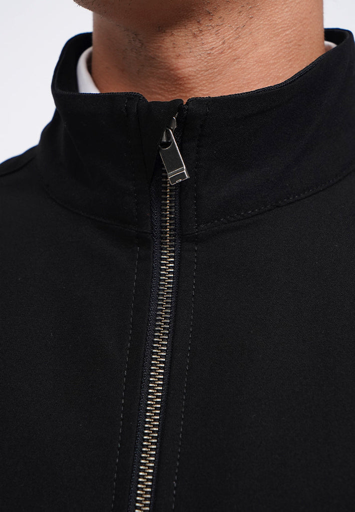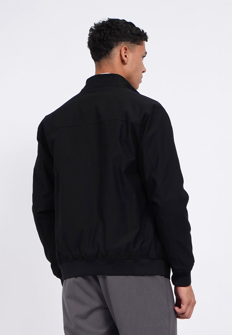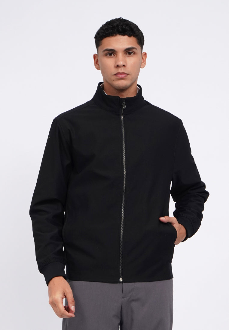 Long sleeve harrington jacket, High neck, Full front zipper opening, Double side pocket details, Material: Polyester Twill, Fit: Slim, Color: Black, Model info: Model Wearing Size M, Height: 182 cm, Chest: 94 cm, Waist: 75 cm, Hips: 96 cm