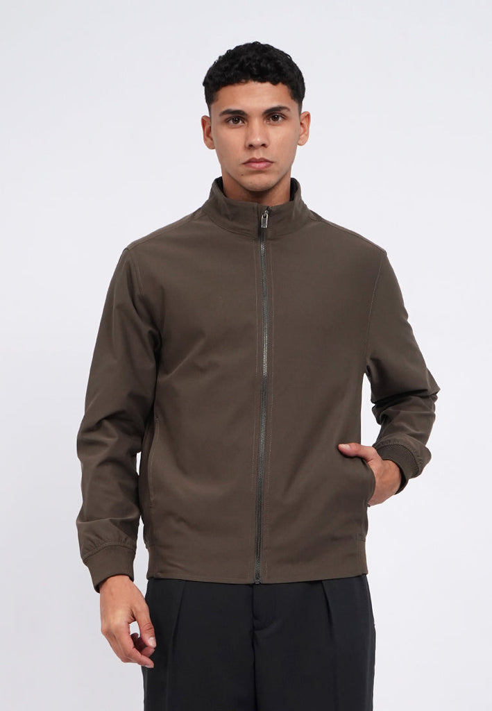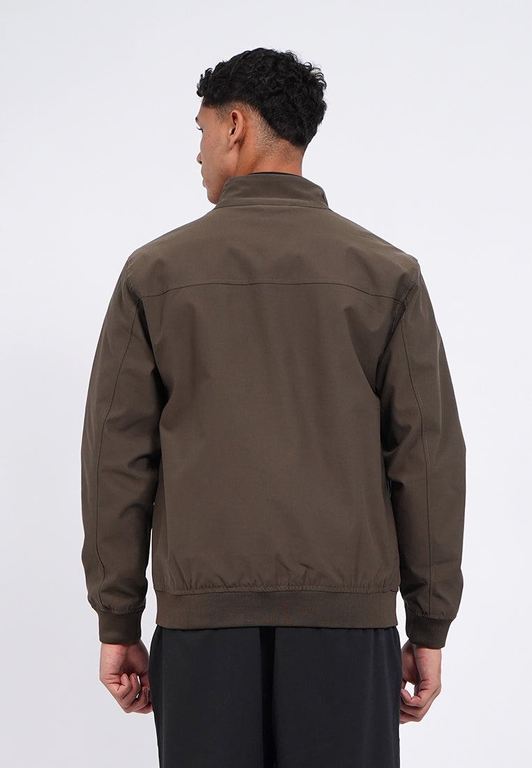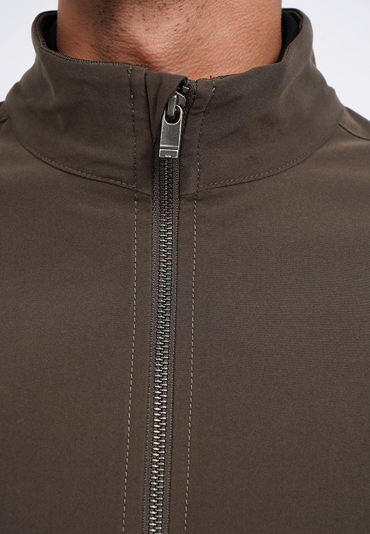 Long sleeve harrington jacket, High neck, Full front zipper opening, Double side pocket details, Material: Polyester Twill, Fit: Slim, Color: Olive, Model info: Model Wearing Size M, Height: 182 cm, Chest: 94 cm, Waist: 75 cm, Hips: 96 cm