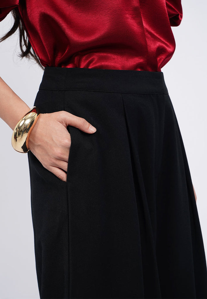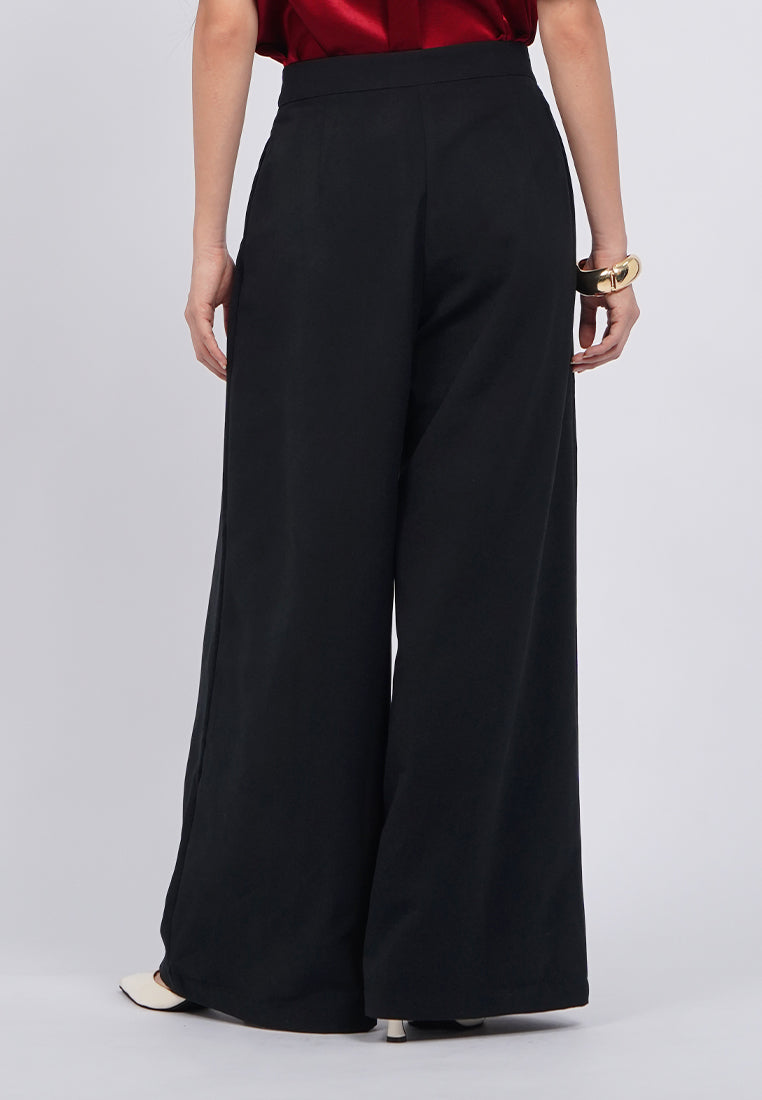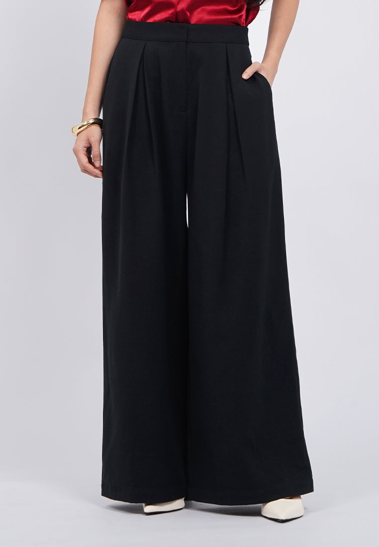 Celana panjang high waist, Wide leg with pleat details, Double side pocket, Material: Polyester, Fit: High Regular Wide Full, Color: Black, Model info: Model Wearing Size S, Height: 168cm, Bust: 74cm, Waist: 62cm, Hips: 86cm
