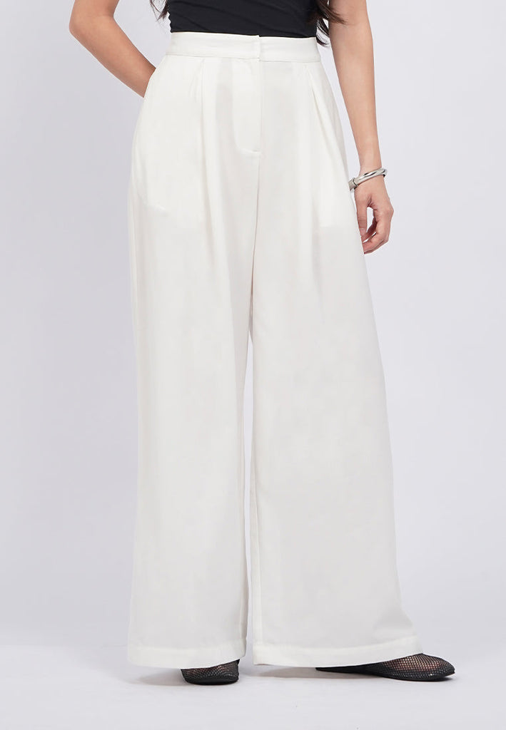 Celana panjang high waist, Wide leg with pleat details, Double side pocket, Material: Polyester, Fit: High Regular Wide Full, Color: Off White, Model info: Model Wearing Size S, Height: 168cm, Bust: 74cm, Waist: 62cm, Hips: 86cm