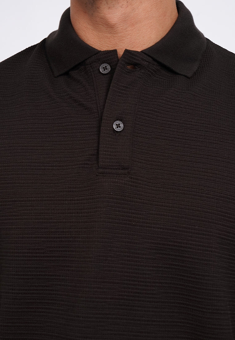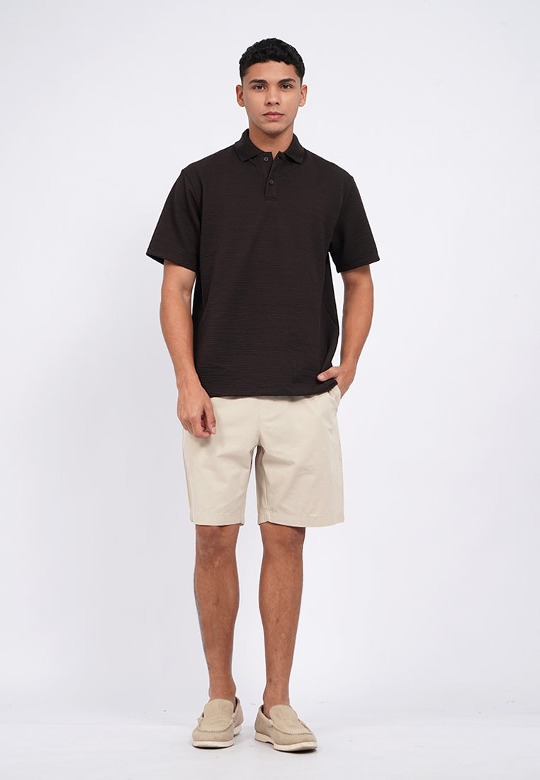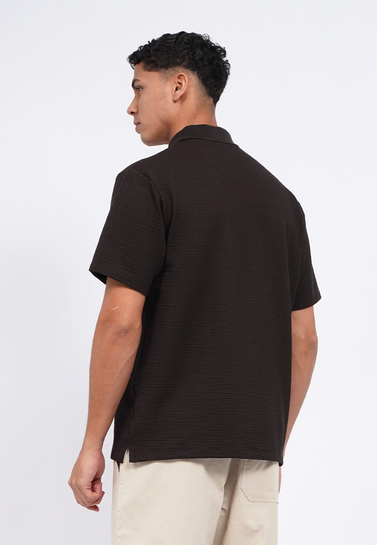 Atasan lengan pendek, Polo collar, Front button opening, Textured fabric, Material: Poly Spandex, Fit: Regular, Color: Coffee Brown, Model info: Model Wearing Size M, Height: 182 cm, Chest: 94 cm, Waist: 75 cm, Hips: 96 cm